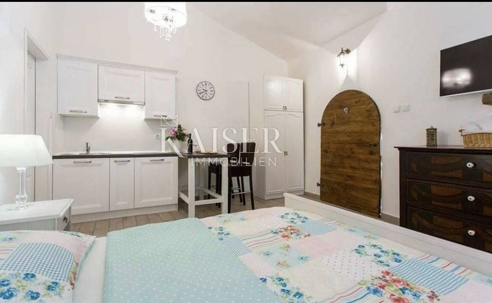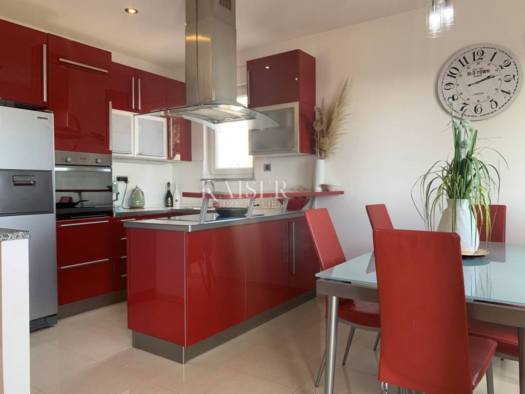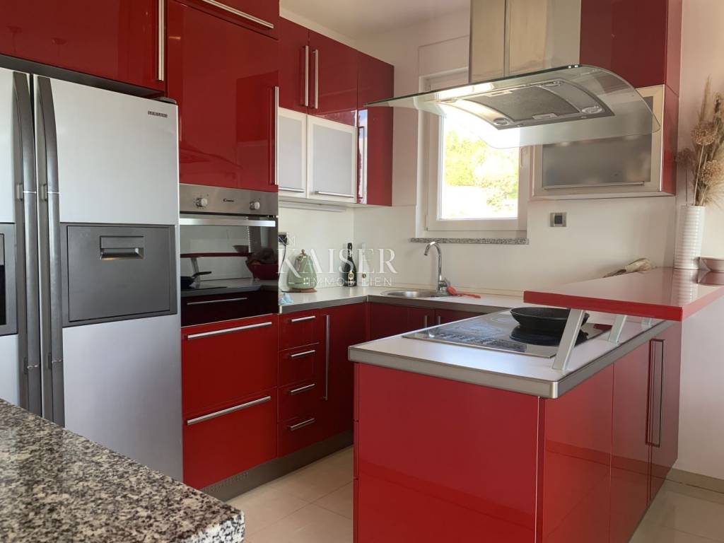 Kaiser Immobilien presenta un appartamento nel cuore di Ičić, a nemmeno 100 metri dal mare. L'appartamento si trova in un piccolo edificio residenziale al secondo piano. Su una superficie di 128 mq abbiamo tre camere da letto, due bagni, un ampio soggiorno con cucina e sala da pranzo che si apre sul terrazzo. Il terrazzo è spazioso e coperto e offre una splendida vista sul mare e sul porticciolo di Aci. Dall'appartamento si accede al sottotetto, utilizzabile anche come ulteriore spazio. Di pertinenza dell'appartamento parte del giardino e due posti auto coperti. Oltre a tutto ciò, il prezzo comprende anche una villetta unifamiliare più piccola composta da una camera da letto, un bagno e una piccola cucina. Separatamente, vi è un altro locale che viene adibito a ripostiglio, dove è presente anche un servizio igienico più piccolo. La casa è utilizzata come locazione turistica durante la stagione estiva.