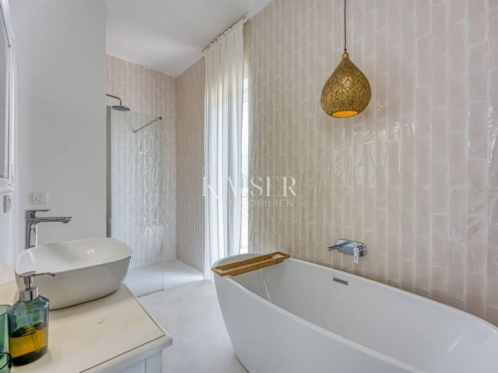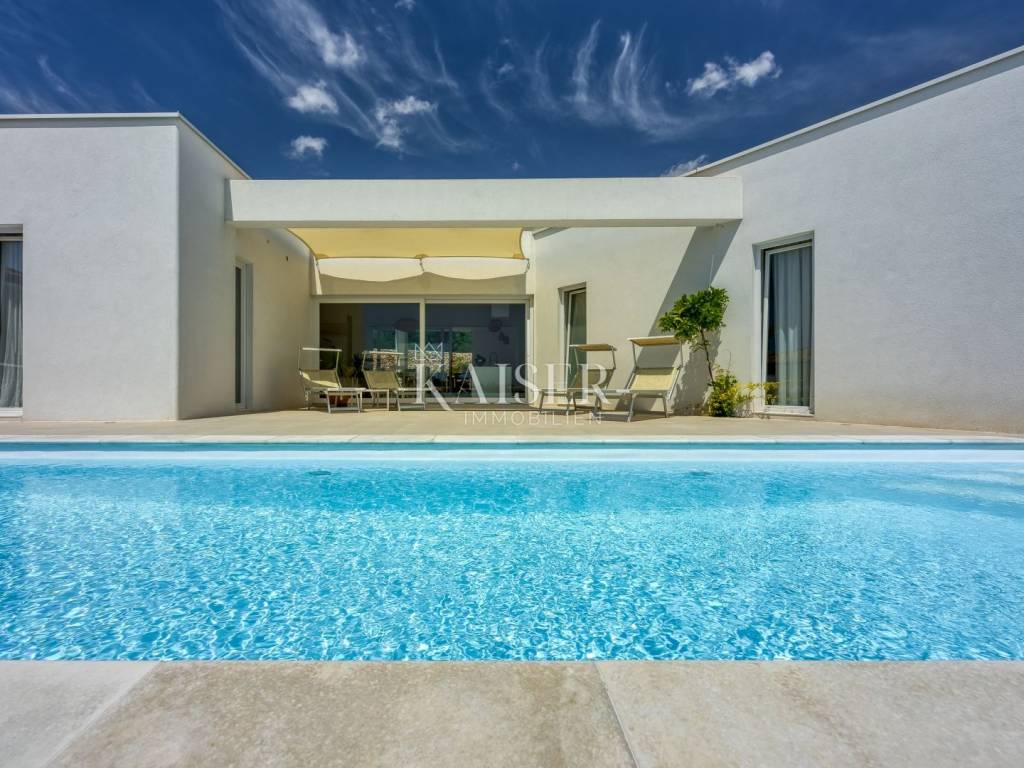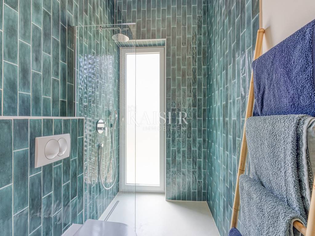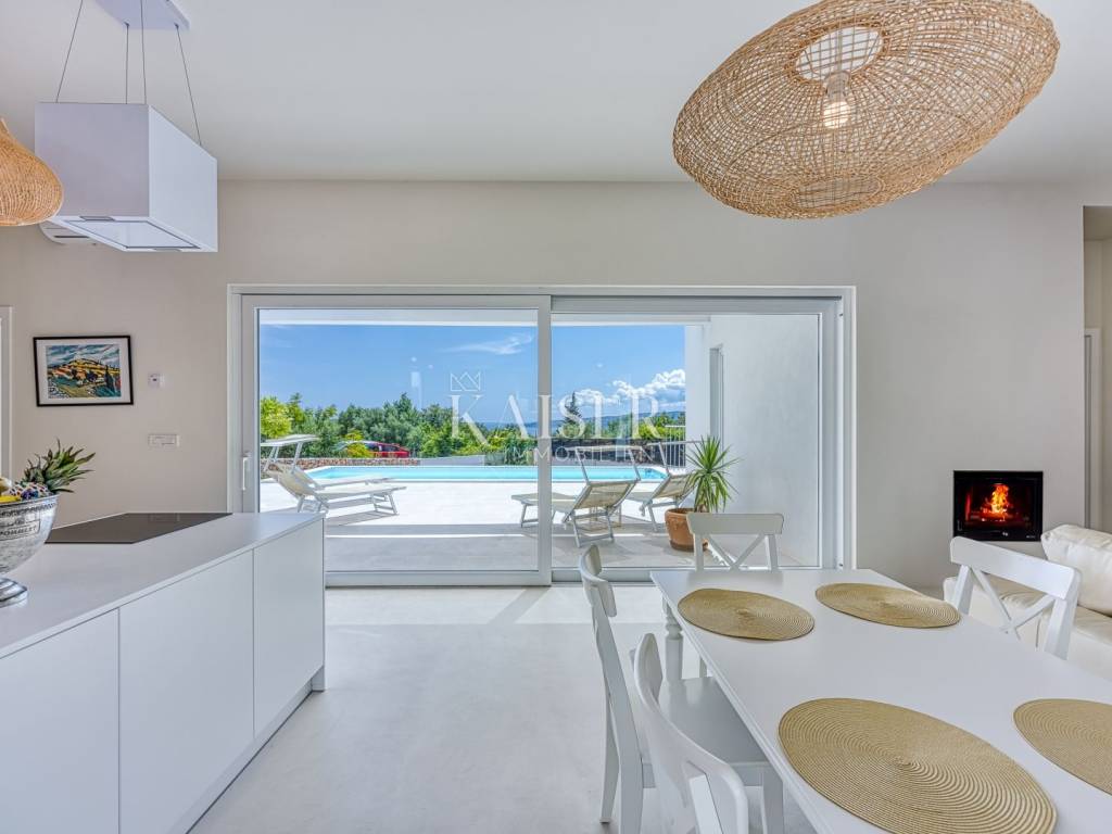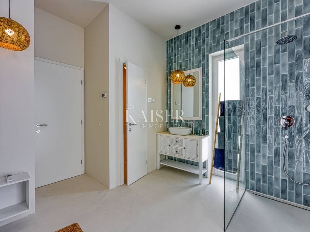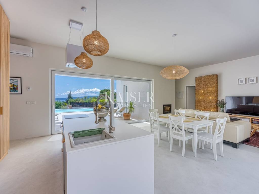 Kaiser Immobilien presenta una bellissima villa indipendente con piscina e una bellissima vista sul mare. L'immobile è composto da un ampio open space quale parte centrale della casa, composto da soggiorno, cucina e sala da pranzo. Oltre ai locali citati, la casa dispone di tre camere da letto, ciascuna con il proprio bagno, oltre ad un ulteriore servizio igienico per gli ospiti. Come stanza aggiuntiva c'è un locale caldaia che può essere utilizzato per riporre oggetti. La casa è circondata da un ampio giardino dove si trova la piscina con acqua salata e c'è spazio sufficiente per parcheggiare più auto. Nei mesi più caldi, i condizionatori situati in ciascuna stanza possono essere utilizzati per il raffreddamento, e nei mesi invernali, oltre al condizionatore, c'è il riscaldamento a pavimento ad acqua in tutta la casa in tutte le stanze, così come la stufa situata nel soggiorno, che contribuisce a creare un'atmosfera piacevole e calda. La struttura si trova in un ambiente tranquillo, a pochi minuti dalla spiaggia, dai negozi e dai trasporti pubblici, e a soli 15 minuti d'auto si trova la città di Krk, che, a seconda dei vostri desideri, offre numerose attrazioni culturali, artistiche, gastronomiche e strutture quotidiane. La proprietà è un'occasione perfetta se siete alla ricerca di uno splendido immobile in un contesto tranquillo per la vita di tutti i giorni, ma anche un'ottima opportunità se volete dedicarvi agli affitti turistici. La provvigione di agenzia per l'acquirente è del 3% + IVA e viene pagata in caso di acquisto di un immobile, alla conclusione del primo atto legale. Per ulteriori informazioni, contattare un agente.