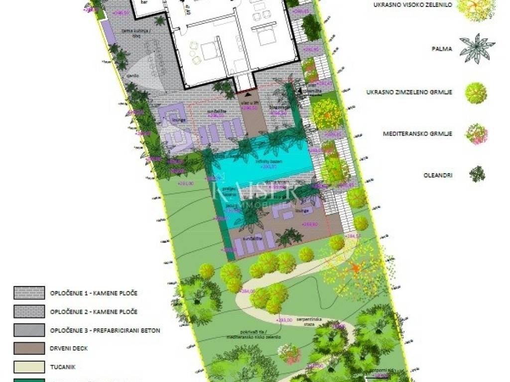 Secondo il progetto, di fronte al terreno e sulla sua destra (ovvero nelle due direzioni più importanti per la vista dalla futura villa) si trova una fascia verde, quindi i futuri proprietari saranno circondati solo da macchia mediterranea, che garantirà loro perfetta tranquillità e privacy.