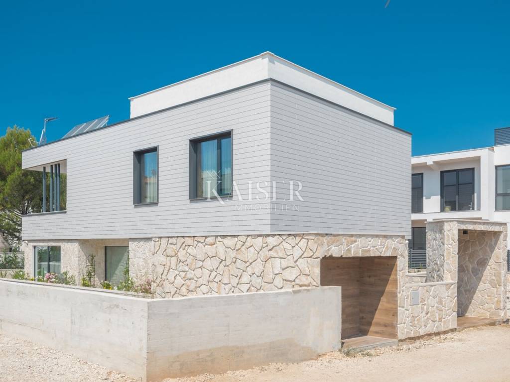 L'edificio è costruito con materiali di alta qualità: il piano terra è rivestito in pietrisco di Benkovac, il primo piano con una facciata ventilata in pannelli di fibrocemento e il tetto è piano con isolamento multistrato. I pavimenti sono realizzati in piastrelle di ceramica di marchi italiani e spagnoli, gli infissi esterni in alluminio hanno eccellenti caratteristiche isolanti, mentre gli infissi interni sono in legno.