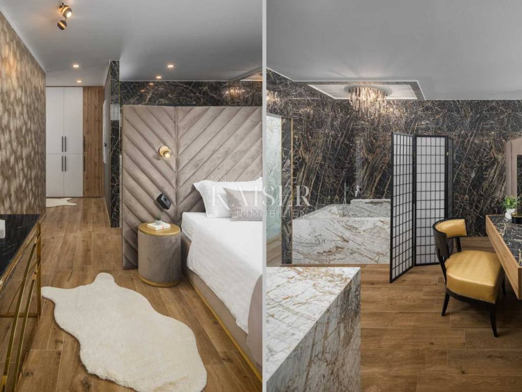Gli interni trasudano lusso: la cucina è in legno di noce, mentre le cassettiere dell'ingresso e della sala da pranzo sono realizzate a mano. Le colonne a mosaico del soggiorno e della sala da pranzo attirano l'attenzione in modo particolare e l'illuminazione è prevalentemente in cristallo, enfatizzando l'atmosfera sofisticata.