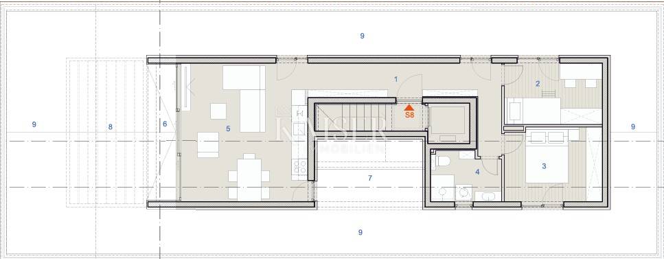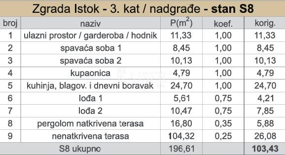 L'attico, contrassegnato S8, si trova al terzo piano (superficie) dell'edificio orientale. La superficie netta utile totale dell'appartamento è di 103,43 m². È stato progettato con cura per enfatizzare spazi aperti e luminosi e un perfetto collegamento con l'ambiente naturale, con viste spettacolari dalle ampie terrazze.