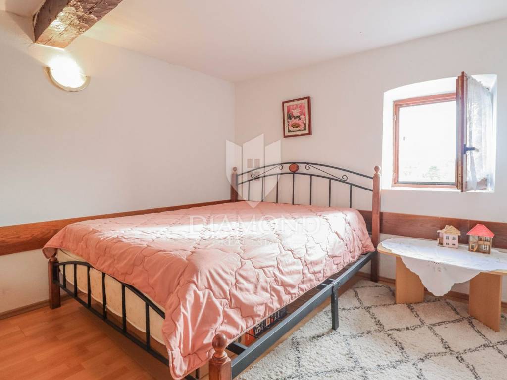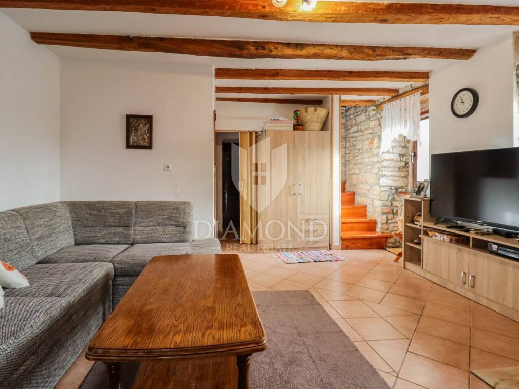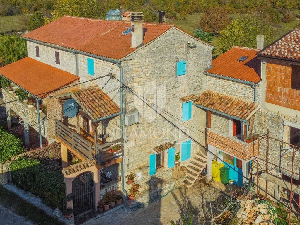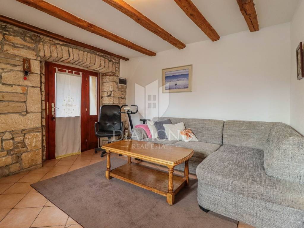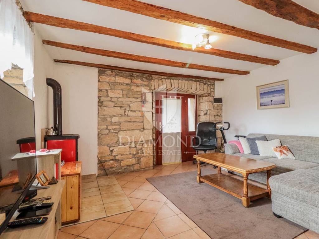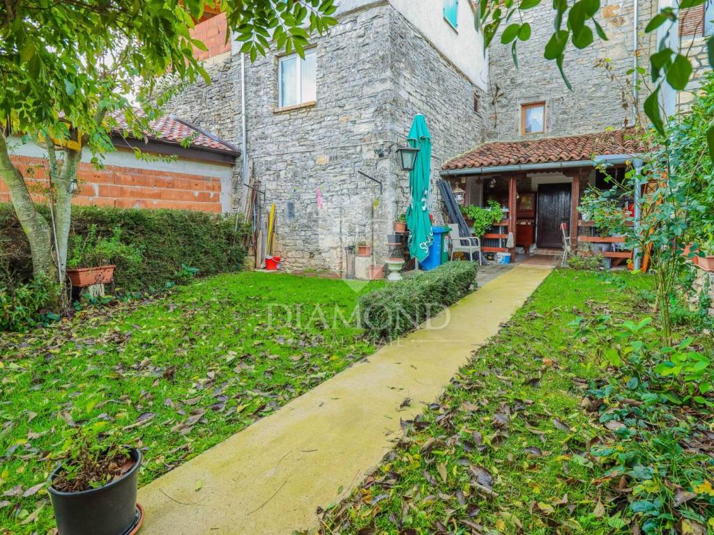La casa è composta da due appartamenti con ingressi separati. Il primo appartamento, più grande, si sviluppa su tre piani. Il piano terra contiene un soggiorno, un bagno e un corridoio che conduce ad una terrazza coperta con cucina estiva e un bel giardino. Al 1° piano c'è una cucina con sala da pranzo con accesso al terrazzo, e al 2° piano ci sono due camere da letto. Il secondo appartamento è in fase di ristrutturazione. Scale esterne in pietra conducono al 1° piano, dove si trova un soggiorno con cucina e sala da pranzo e un bagno. C'è una grande camera da letto al 2° piano. Il riscaldamento è a legna. La casa dispone anche di un garage, che volendo può essere trasformato in mensa. È stato costruito in stile istriano, con dettagli in pietra e legno tardi che gli conferiscono un bellissimo stile autoctono.