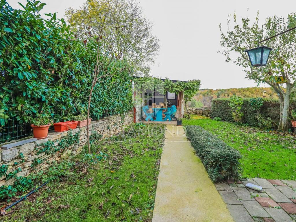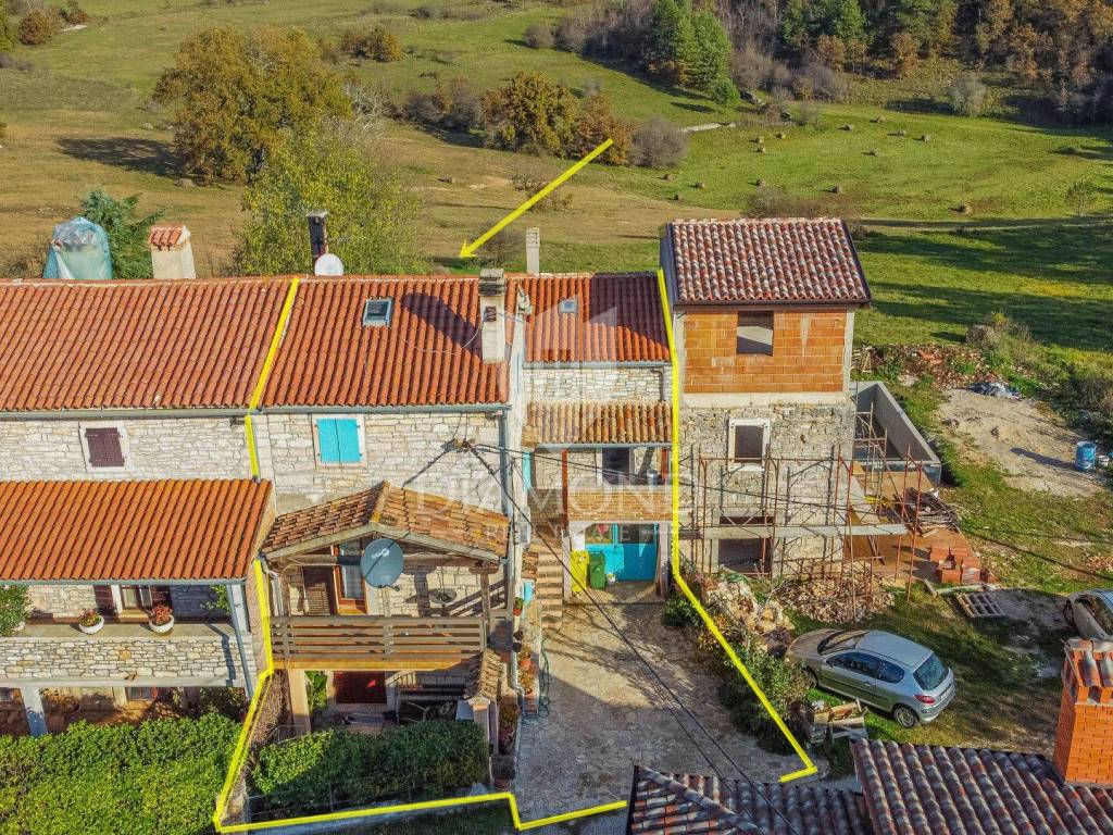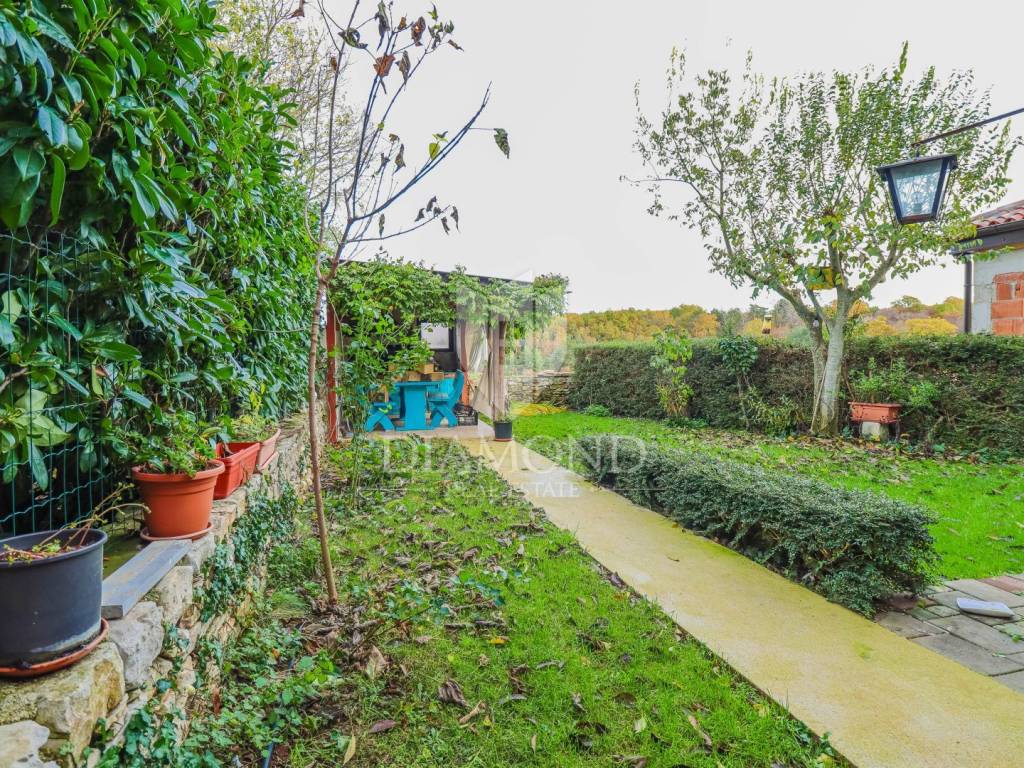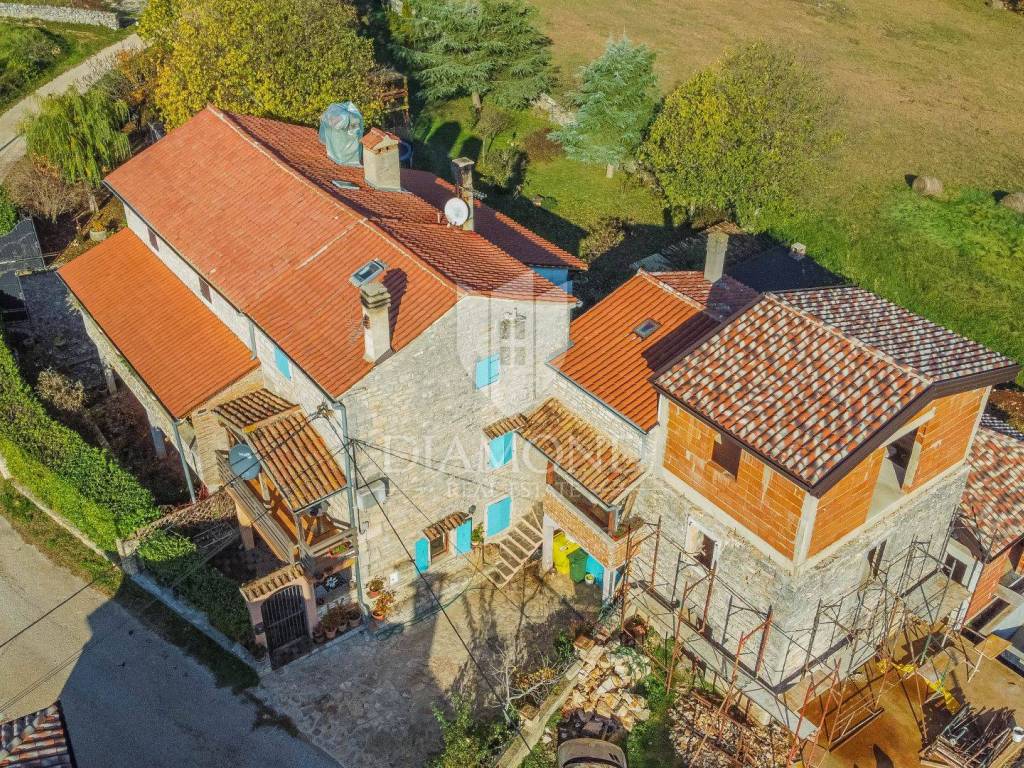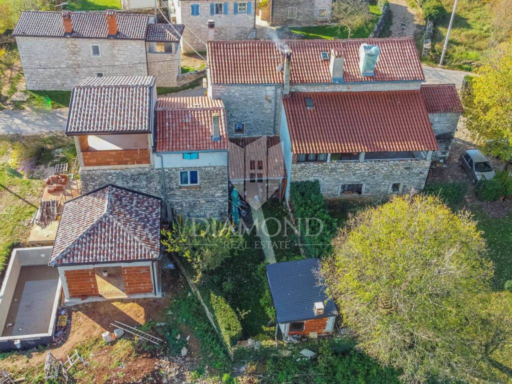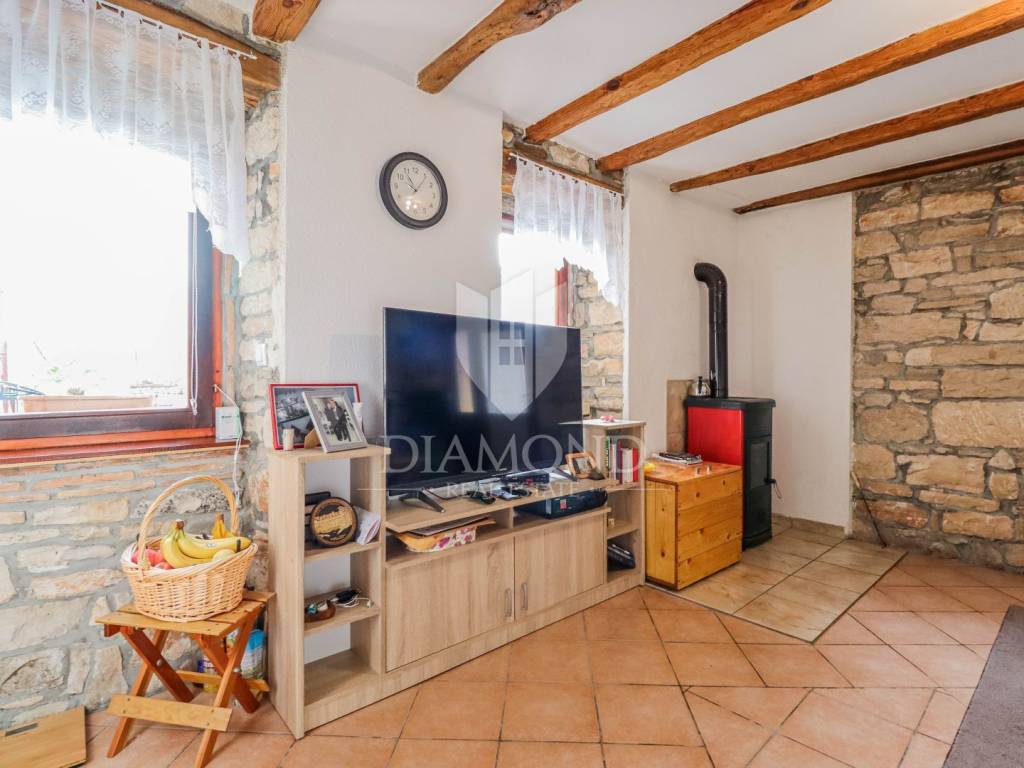 La casa è composta da due appartamenti con ingressi separati. Il primo appartamento, più grande, si sviluppa su tre piani. Il piano terra contiene un soggiorno, un bagno e un corridoio che conduce ad una terrazza coperta con cucina estiva e un bel giardino. Al 1° piano c'è una cucina con sala da pranzo con accesso al terrazzo, e al 2° piano ci sono due camere da letto. Il secondo appartamento è in fase di ristrutturazione. Scale esterne in pietra conducono al 1° piano, dove si trova un soggiorno con cucina e sala da pranzo e un bagno. C'è una grande camera da letto al 2° piano. Il riscaldamento è a legna. La casa dispone anche di un garage, che volendo può essere trasformato in mensa. È stato costruito in stile istriano, con dettagli in pietra e legno tardi che gli conferiscono un bellissimo stile autoctono.