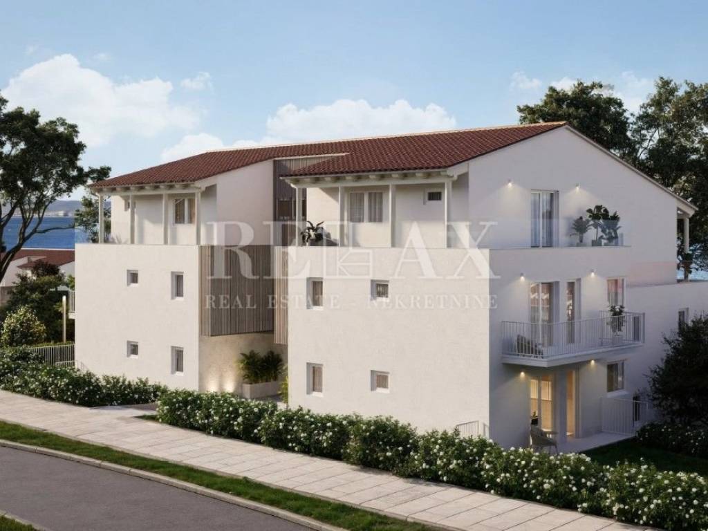 In vendita un lussuoso appartamento con due camere da letto, situato al piano terra di un edificio in prima fila sul mare, all'interno di un resort esclusivo a Novi Vinodolski. Con una superficie totale di 68,27 m², l'appartamento è composto da soggiorno con cucina e zona pranzo, due camere da letto, due bagni, ingresso e terrazza con accesso diretto all'ambiente mediterraneo curato e alla passeggiata sul mare.