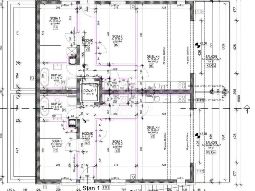 Stan se sastoji od dvije prostrane spavaće sobe, od kojih master spavaća soba ima vlastitu walk-in kupaonicu, dva WC-a, te prostranog dnevnog boravka s blagovaonicom i kuhinjom u open-space formatu. Tu su i hodnik, spremište, veliki balkon, privatna terasa te dvorište – savršeno za opuštanje ili druženje na otvorenom.