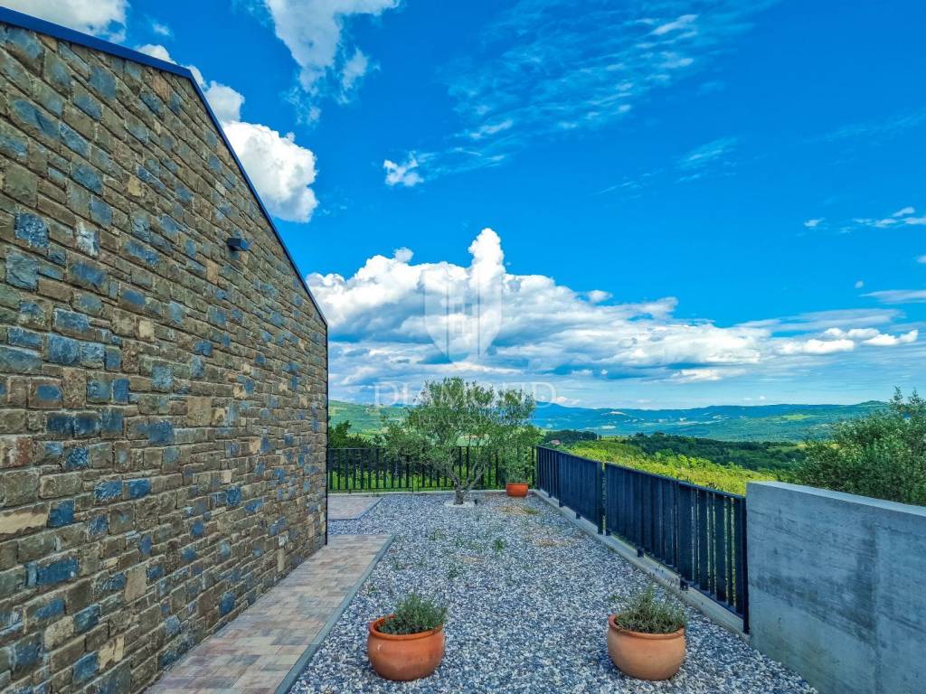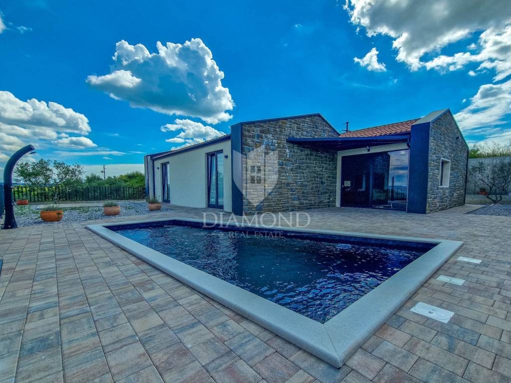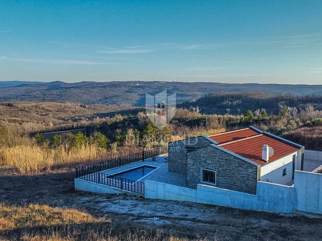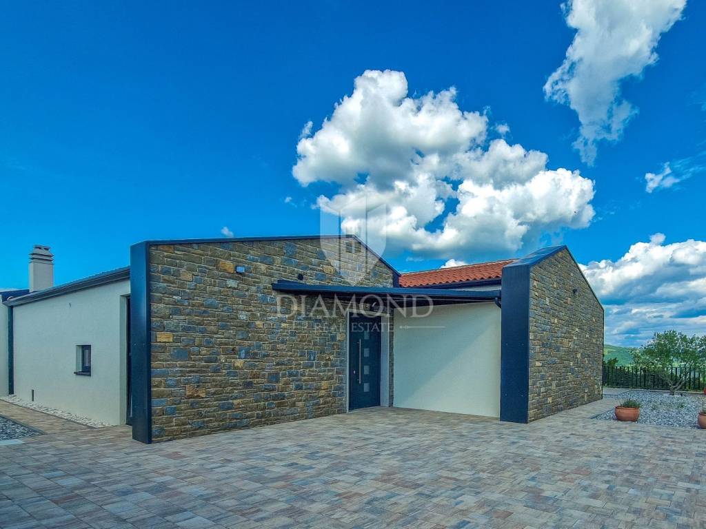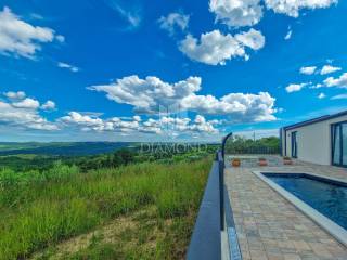 Kuća ukupne površine 145m2, s dvije spavaće, bazenom i neponovljivim pogledom na Motovun i dolinu rijeke Mirne. Ova lijepa prizemnica sastoji se od dnevnog boravka s kuhinjom i blagovaonicom, dvije spavaće sobe svaka sa svojim kupatilom te prostorijom za vešeraj s wc-om za goste. Iz dnevnog boravka se izlazi na otvorenu terasu s koje se pristupa na uređenu okućnicu na kojoj se nalazi bazen i sunčalište s prekrasnim otvorenim panoramskim pogledom na dolinu rijeke Mirne i na čarobni grad Motovun. Kuća je kvalitetne gradnje s podovima i stolarijom vrhunske kvalitete. Građena je u modernom stilu s dodacima Istarskog tamnog kamena iz unutrašnjosti Istre te visokim stropovima.