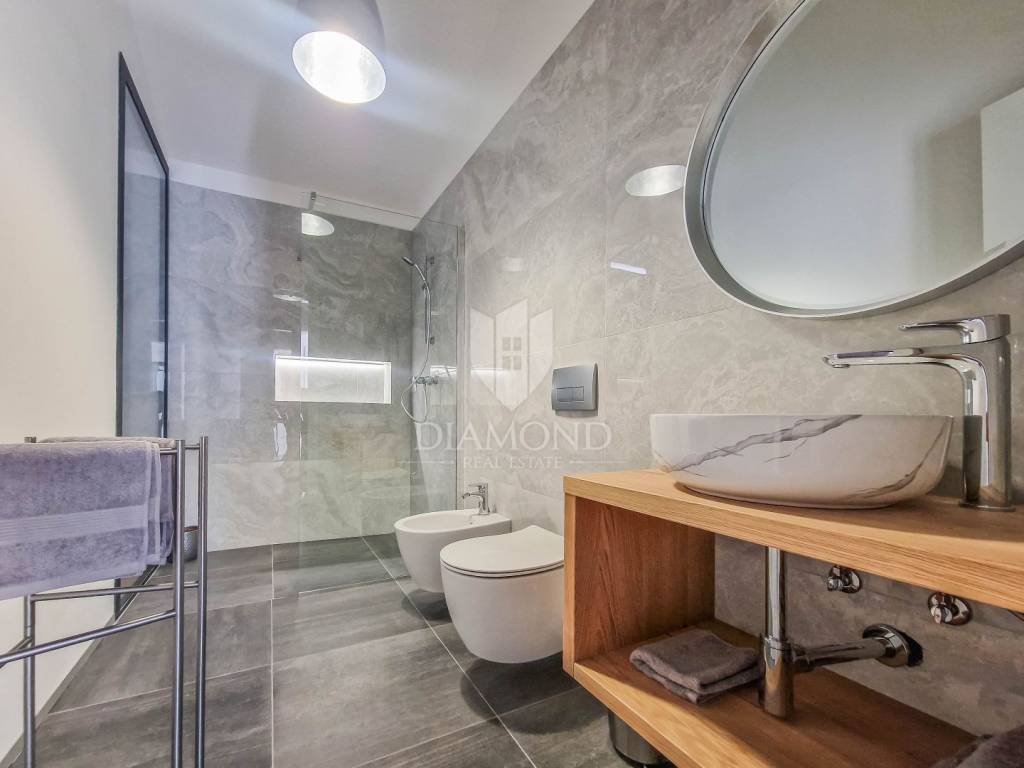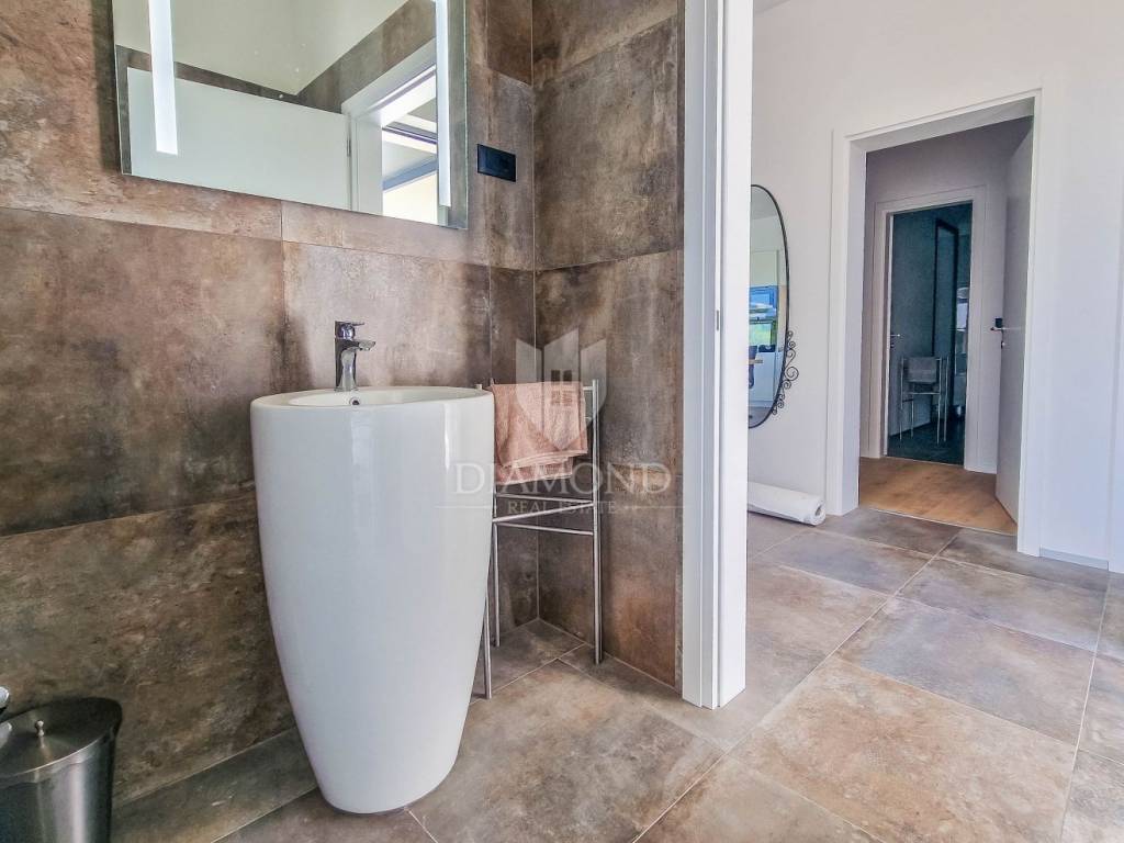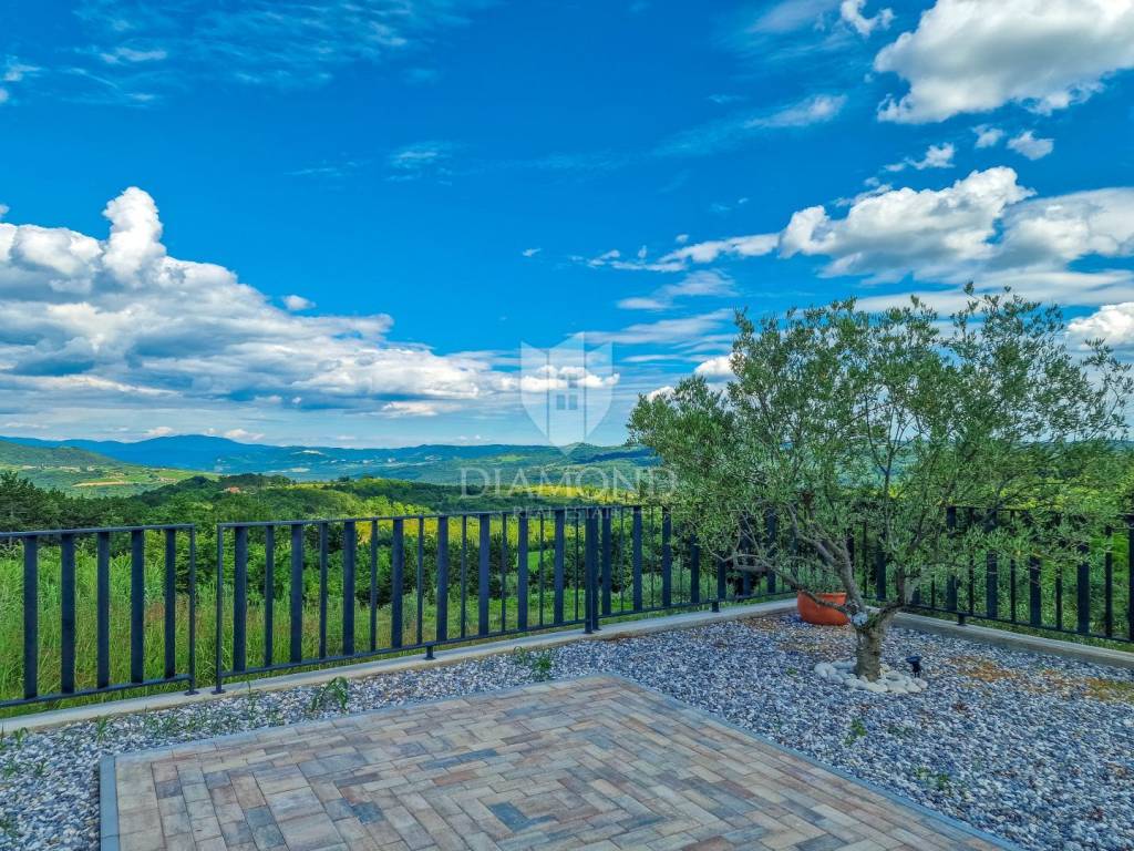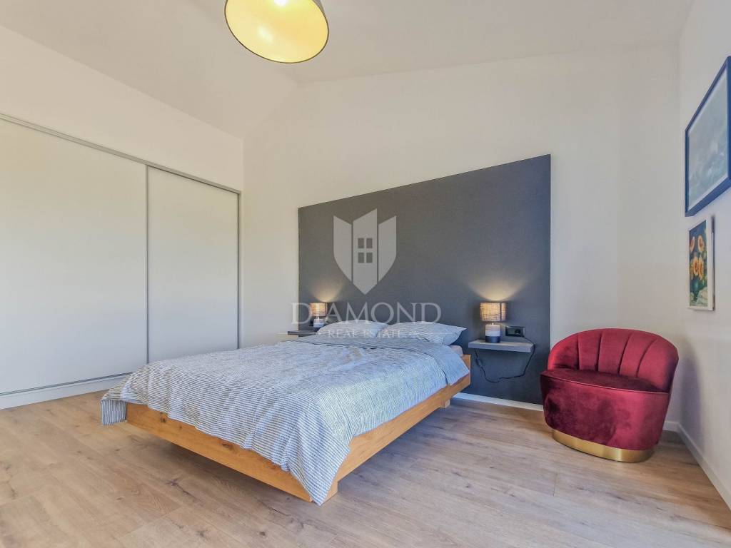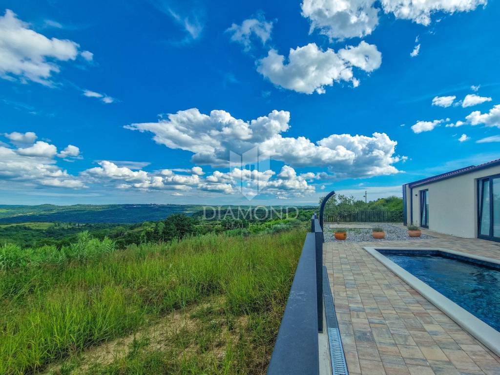 Kuća ukupne površine 145m2, s dvije spavaće, bazenom i neponovljivim pogledom na Motovun i dolinu rijeke Mirne. Ova lijepa prizemnica sastoji se od dnevnog boravka s kuhinjom i blagovaonicom, dvije spavaće sobe svaka sa svojim kupatilom te prostorijom za vešeraj s wc-om za goste. Iz dnevnog boravka se izlazi na otvorenu terasu s koje se pristupa na uređenu okućnicu na kojoj se nalazi bazen i sunčalište s prekrasnim otvorenim panoramskim pogledom na dolinu rijeke Mirne i na čarobni grad Motovun. Kuća je kvalitetne gradnje s podovima i stolarijom vrhunske kvalitete. Građena je u modernom stilu s dodacima Istarskog tamnog kamena iz unutrašnjosti Istre te visokim stropovima.