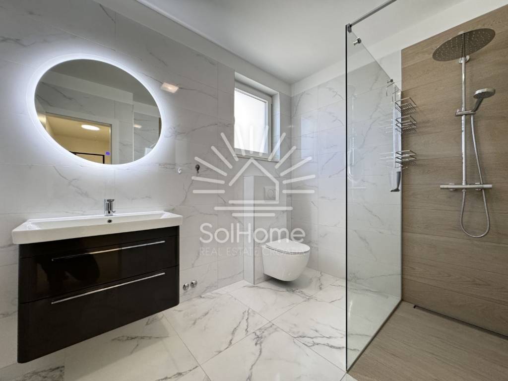 Caratteristiche speciali: - Piastrelle, apparecchi igienici e mobili di alta qualità - Aria condizionata per riscaldamento e raffreddamento - Riscaldamento a pavimento nei bagni - Preparazione per il caminetto - Serramenti in PVC con triplo vetro - Porte d'ingresso antiscasso e antincendio - Citofono senza ricevitore (sistema hands-free) - Facciata in polistirolo da 10 cm per un'ottimale isolamento termico - Orientamento sud-ovest per abbondante luce naturale - Completamente arredato, compresa la nuova cucina
