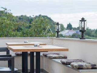 Al piano terra dell'edificio si trovano la reception, due bagni e un lounge bar cafè con tre terrazze dalle quali si può godere della vista della piazza vecchia da un lato e del mare e di Rabac dall'altro. L'area della terrazza è di 120 mq.