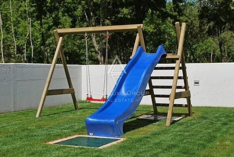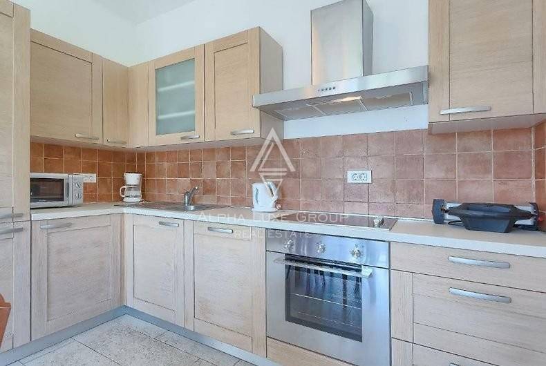 Il piano terra si apre su un accogliente corridoio, che conduce a un elegante soggiorno e ad una cucina ben attrezzata con zona pranzo. La villa è climatizzata con aria condizionata e riscaldamento a gas, garantendo comfort tutto l'anno. Le caratteristiche ecologiche includono pannelli solari per il riscaldamento dell'acqua sanitaria. La proprietà è adornata con mobili contemporanei ed è offerta completamente arredata.