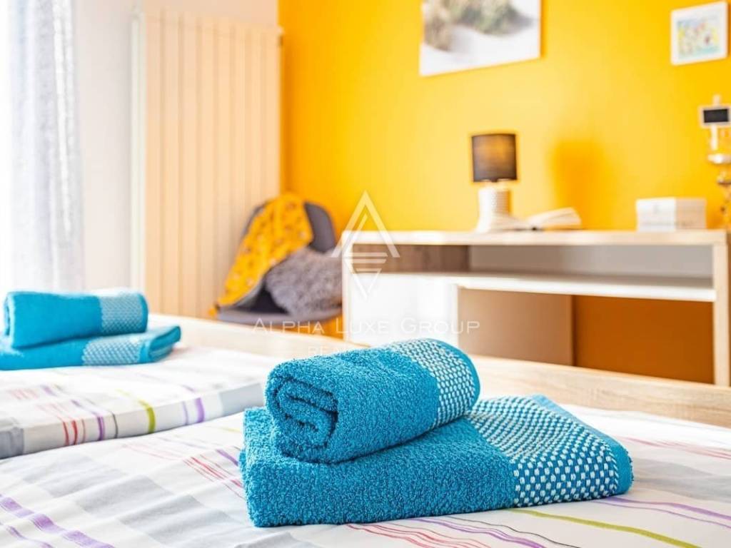 La proprietà si estende su 246 m² distribuiti su due piani, con ogni piano che ospita un'unità abitativa completa. Al piano terra, un appartamento di 123 m² dispone di soggiorno, zona pranzo, cucina, tre camere da letto, un bagno, un ripostiglio e accesso a una terrazza coperta. Il piano superiore riflette questa disposizione con un bagno aggiuntivo, offrendo ampio spazio e privacy per residenti o ospiti.