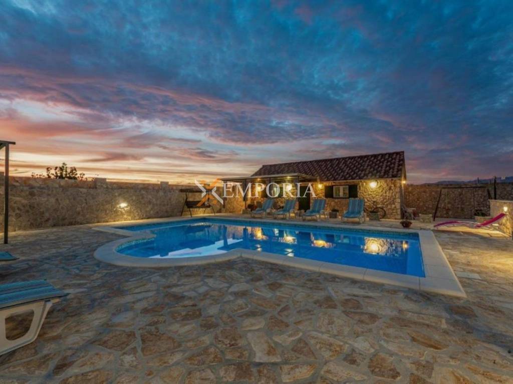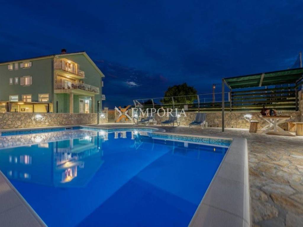 For sale is a spacious house with a swimming pool located in Donje Biljane, set in a peaceful environment 8 km from the sea and 3 km from the town centre. This property stands out due to its large plot, multiple residential units, and additional facilities, making it ideal for family living, tourist rental, or a combination of both.The house is spread over several levels, including a basement, ground floor, first floor, and second floor. The basement features a traditional tavern with a kitchen and a wine storage room, with an area of approximately 48 m², while the total basement area is around 120 m². The ground floor, first floor, and second floor each consist of a three-bedroom apartment with an approximate area of 120 m² per floor. In the courtyard, there are two additional detached houses, one measuring 50 m² arranged as a one-bedroom apartment and another measuring 30 m² designed as a studio apartment. The total living area of all residential buildings is approximately 560 m².The landscaped yard provides parking space for up to 20 vehicles, while the garage covers an area of 50 m². The outdoor area includes a 40 m² concrete swimming pool with preparation for heating, as well as a football and basketball court measuring 20 m x 13 m located next to the pool. The total built area including the pool and garage amounts to 650 m², while the land plot covers 1.600 m².