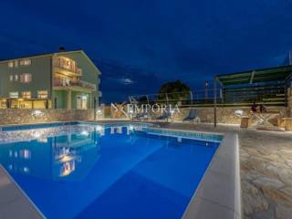 The property is sold fully furnished. Heating on the first floor is provided by a wood-burning stove, while air conditioning units are installed in all apartments and both smaller houses, with a total of five units. The house is built of brick, features PVC and aluminium windows with aluminium shutters, and includes a chimney. The floors are finished with ceramic tiles and laminate, and the roof is pitched. Two outdoor barbecues are available, one in the yard and one located in the basement tavern.The house was originally built in 1987 and fully renovated in 2021, during which approximately 4.000 m² of stone was used for both the house and the courtyard. This property represents an excellent opportunity for buyers seeking a large, versatile house with a swimming pool, additional apartments, and generous outdoor space in a quiet inland location.