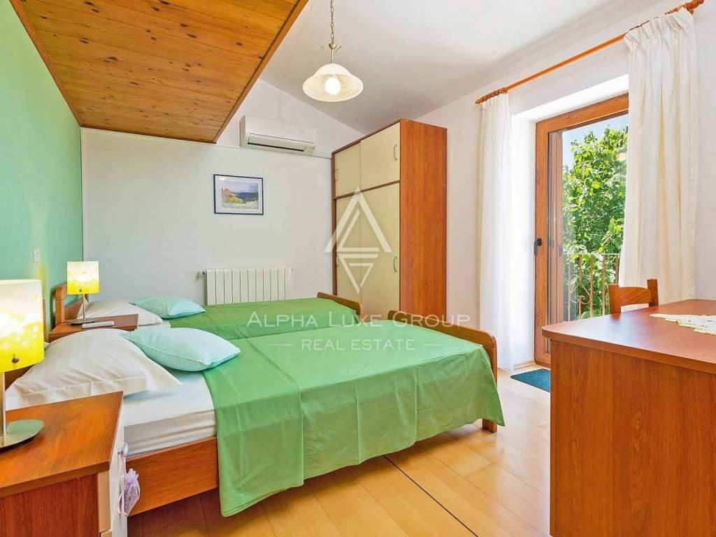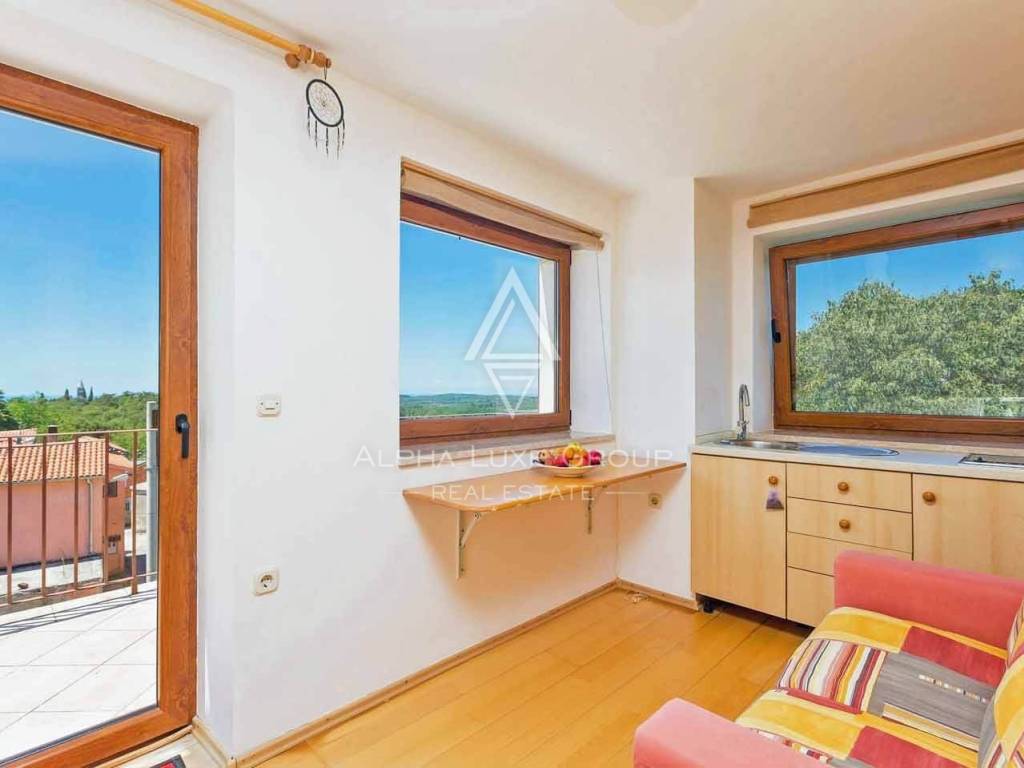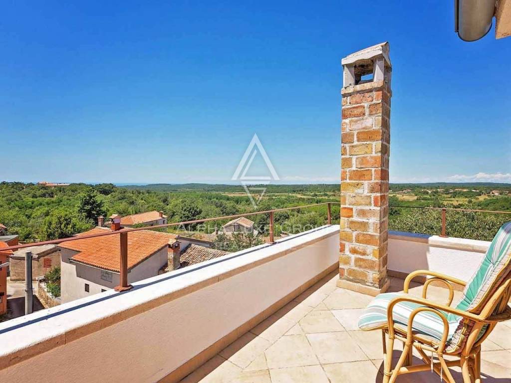 La casa si sviluppa su quattro livelli, ciascuno progettato con cura per offrire il massimo comfort e funzionalità, oltre a panorami mozzafiato sul paesaggio circostante. Il piano terra ospita una taverna rustica con camino aperto, perfetta per momenti conviviali e per gustare la cucina tradizionale istriana. Su questo livello si trovano anche un bagno completamente attrezzato e una sala caldaia per il riscaldamento centralizzato a legna. Il primo piano vanta un'ampia loggia con barbecue integrato e tavolo in legno, un accogliente ingresso, due camere da letto confortevoli, un bagno moderno, un ampio soggiorno con zona pranzo e una cucina completamente attrezzata. Una grande terrazza offre un angolo tranquillo per godersi il paesaggio.