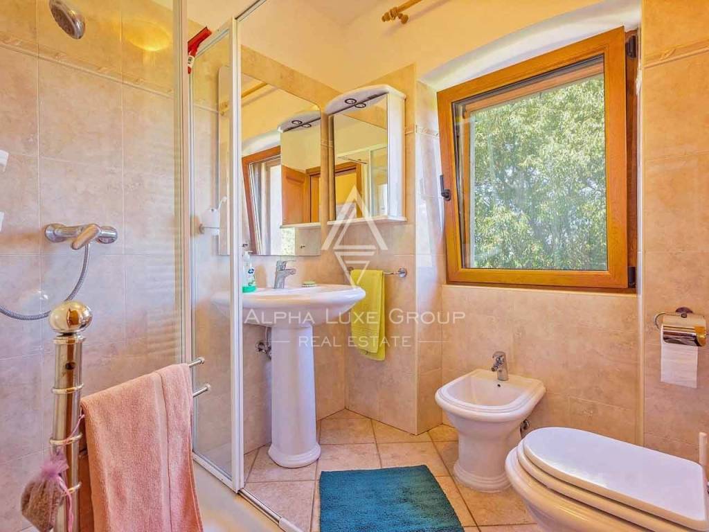 Una scala in legno conduce al secondo piano, dove si trovano altre due camere da letto, un secondo bagno, una terrazza privata e un piccolo studio con angolo cottura. All'ultimo piano, una sala panoramica chiusa da pareti in vetro si apre su una terrazza spettacolare, offrendo una vista a 360° sulle colline istriane, i villaggi circostanti e il lontano Mar Adriatico.