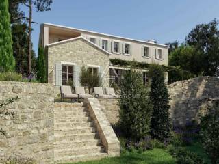Questa villa combina architettura moderna e antiche fondamenta in pietra con vista sul mare, sui vigneti e sugli uliveti.
