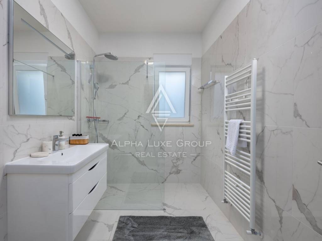 Il piano superiore comprende tre camere da letto, ciascuna con bagno privato e accesso a un'ampia terrazza che offre una vista panoramica sul mare che si estende fino a Venezia nelle giornate limpide. Il seminterrato funge da area funzionale con garage per due auto, una cantina e ulteriore spazio di stoccaggio, tutto controllato in temperatura per un uso ottimale.