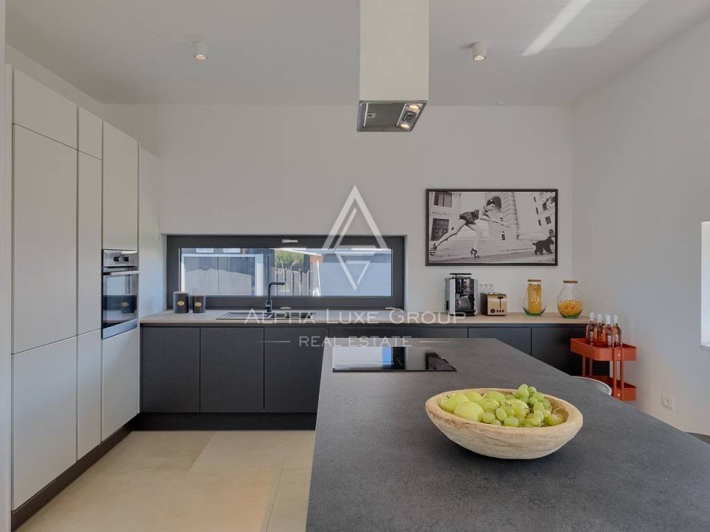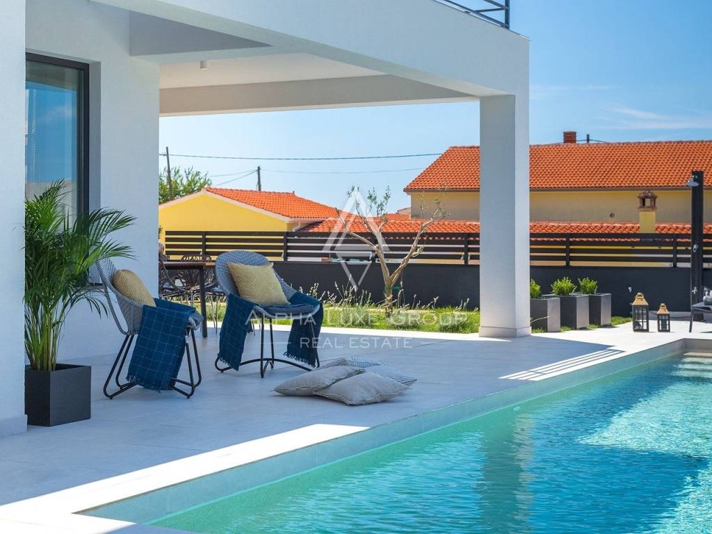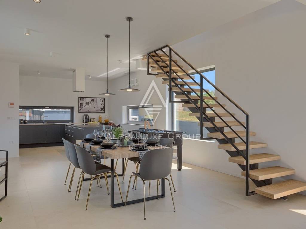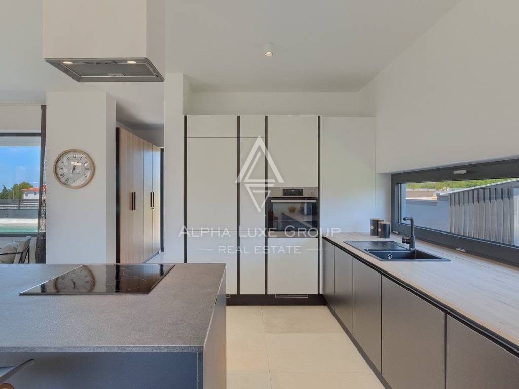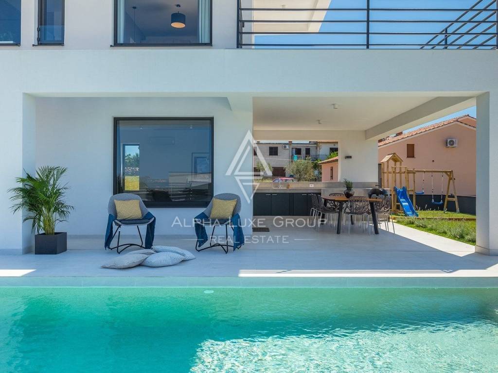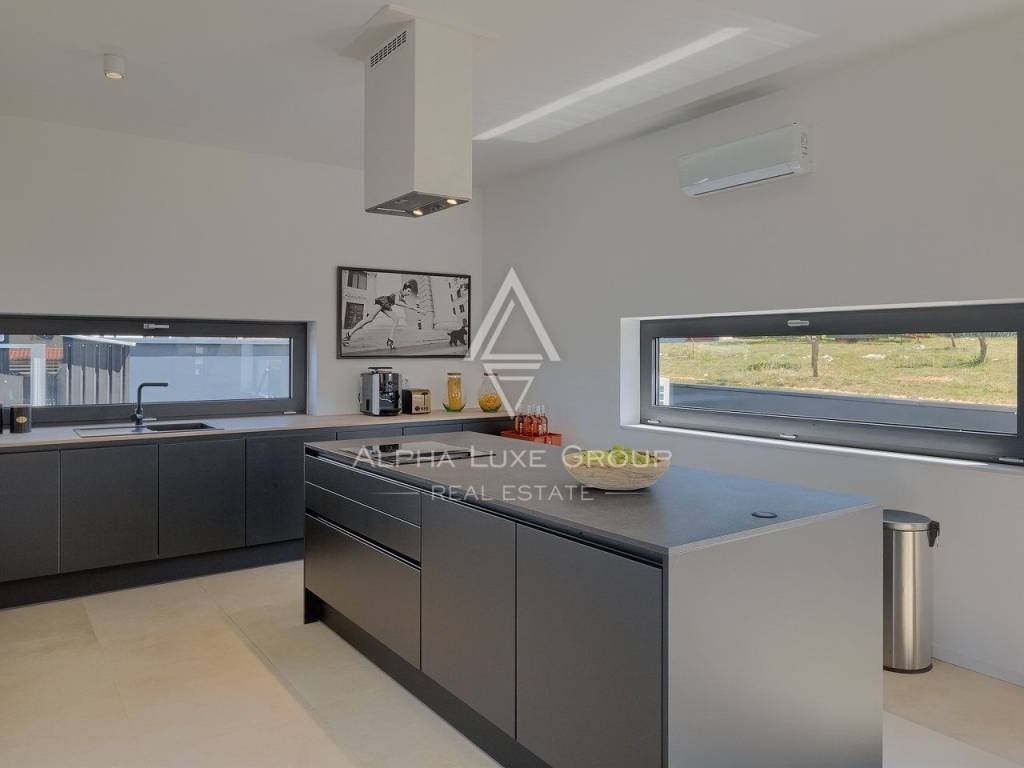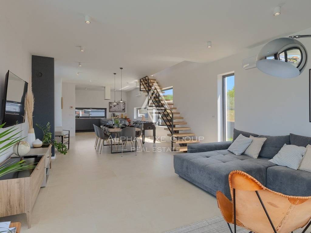 In vendita una splendida villa di lusso situata in una tranquilla zona di Galižana, Vodnjan. Questa moderna proprietà offre 136 m² di spazio abitativo, progettata con grande attenzione ai dettagli e rifinita con materiali di alta qualità. La villa si sviluppa su due piani, offrendo ampio spazio per il comfort e il relax. Il piano terra presenta un ampio open space con cucina completamente attrezzata, soggiorno, sala da pranzo e un bagno per gli ospiti. Le grandi vetrate offrono una vista mozzafiato sulla piscina, su un giardino ben curato con cucina esterna, area barbecue e viste panoramiche sulla vegetazione circostante e sulle Isole Brioni.