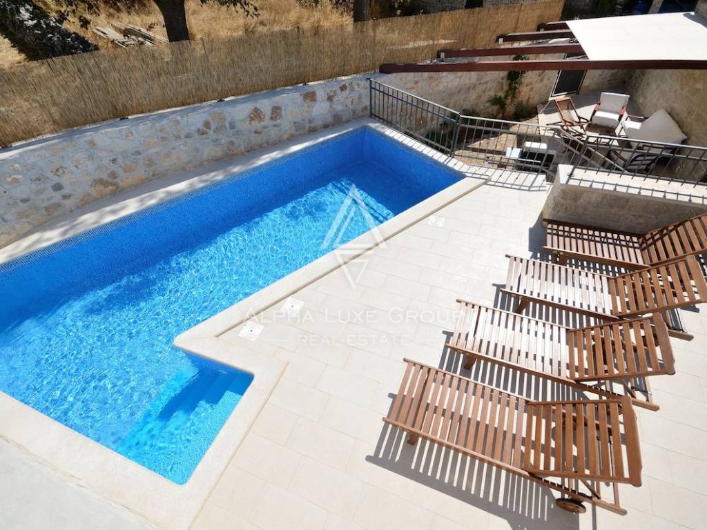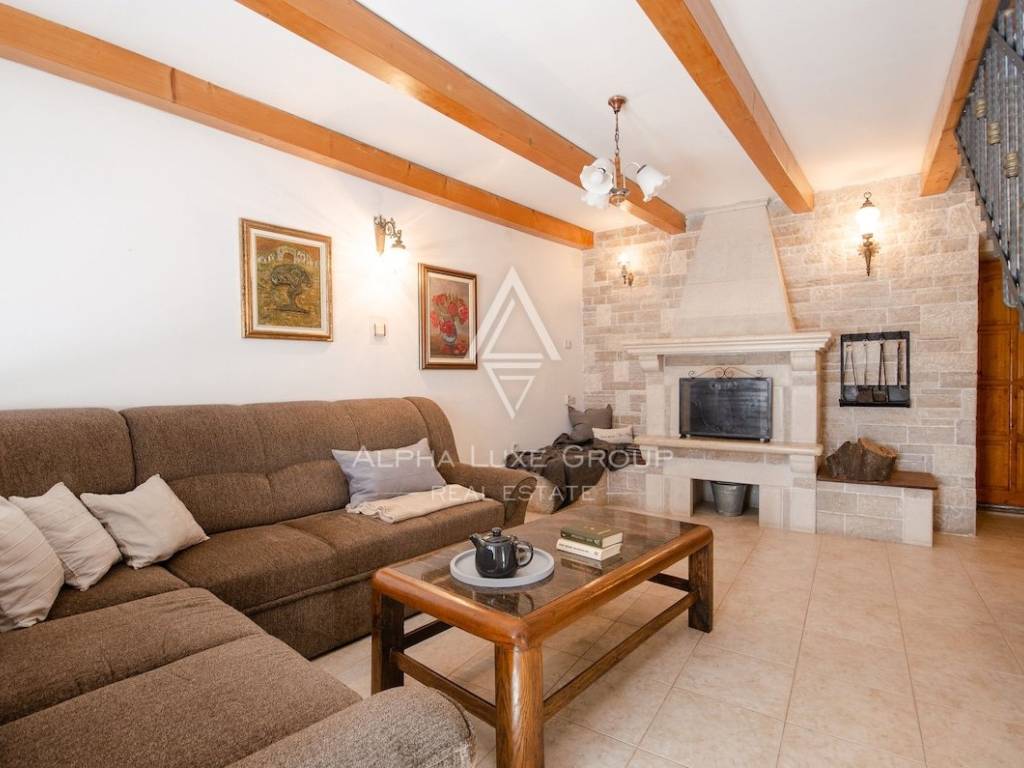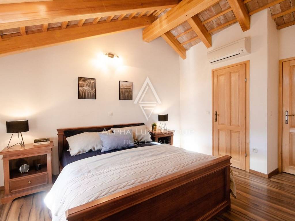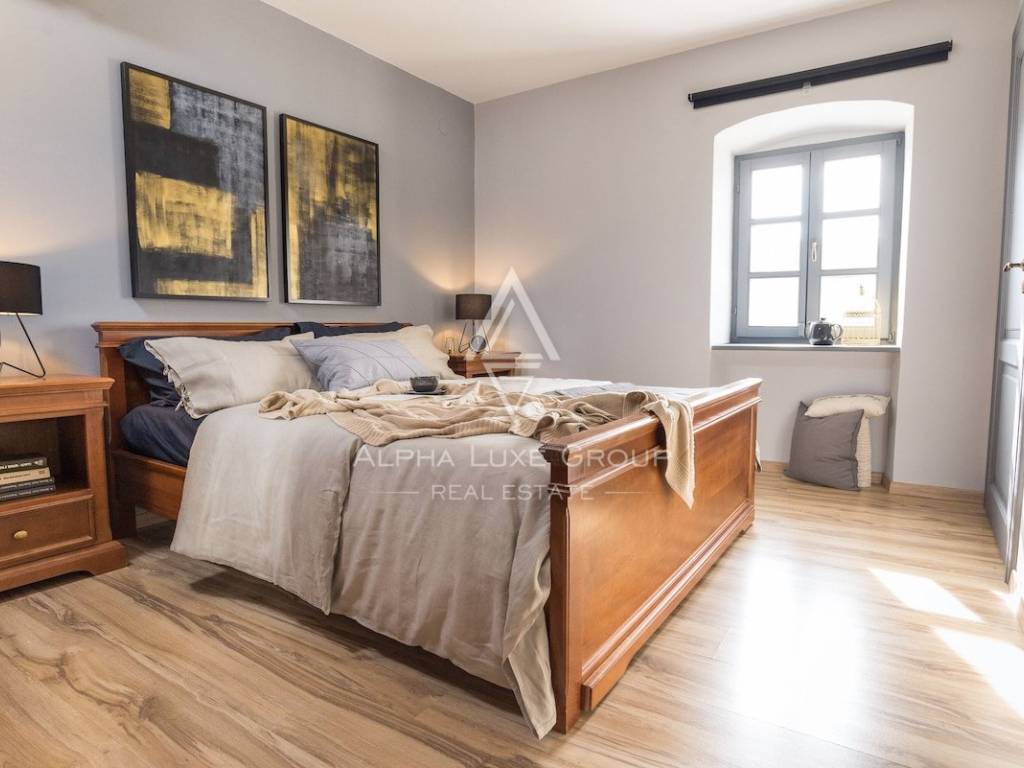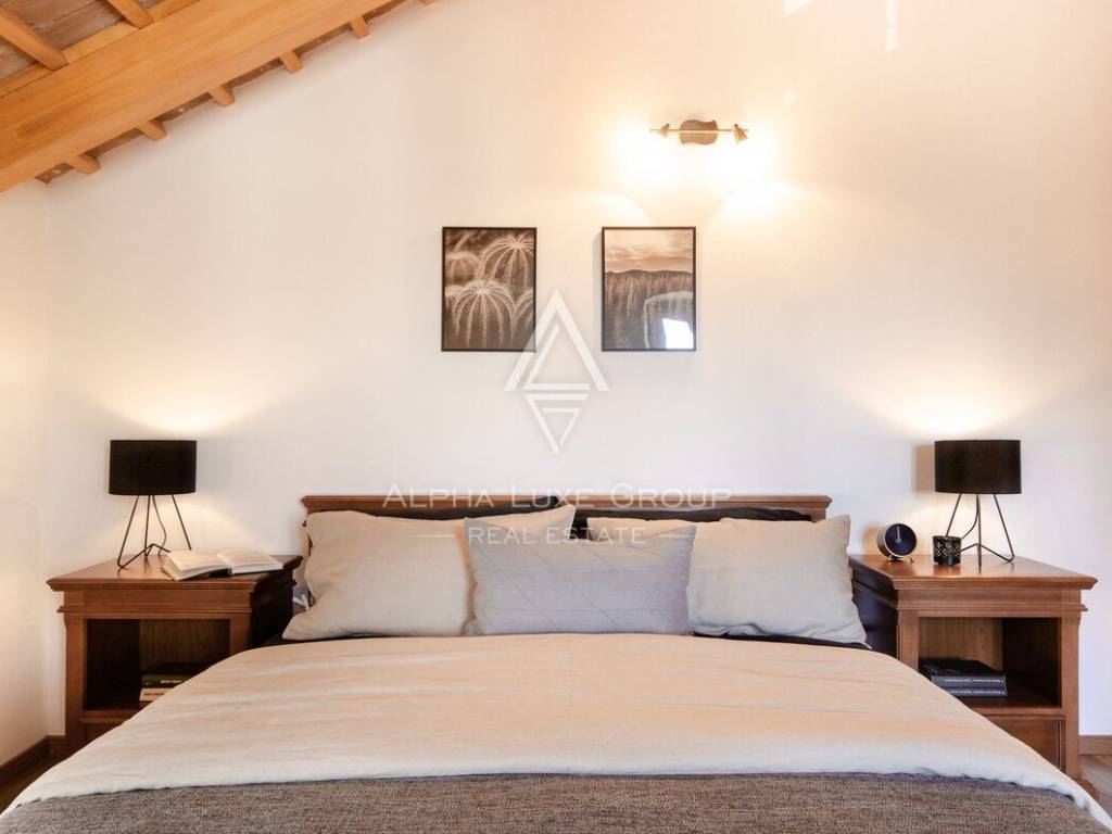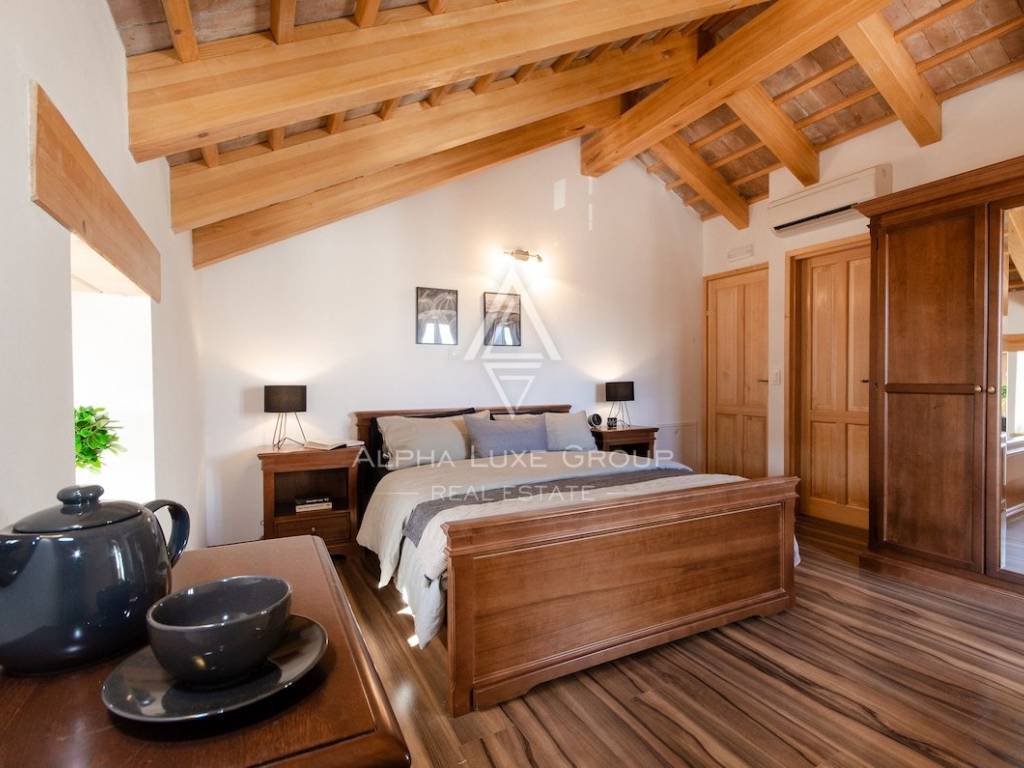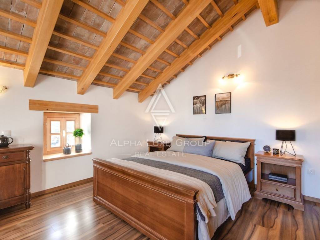 Gli interni coprono circa 220 m² distribuiti su tre livelli. Il piano terra comprende una cucina completamente attrezzata con zona pranzo, un elegante soggiorno con camino e un bagno per gli ospiti. Una scala interna in pietra conduce al primo piano, dove si trovano due comode camere da letto, entrambe dotate di bagno privato. L’ultimo piano ospita due ulteriori camere spaziose, anch’esse con bagno en suite, offrendo il massimo comfort per la famiglia e gli ospiti.