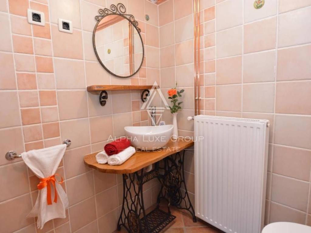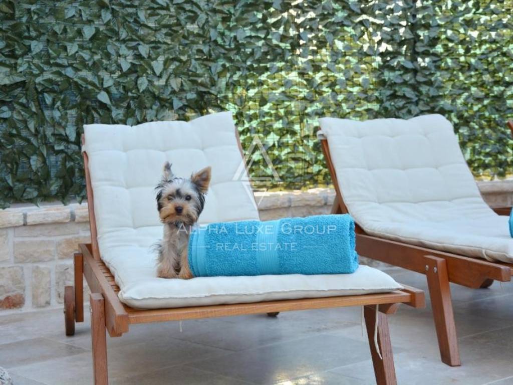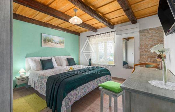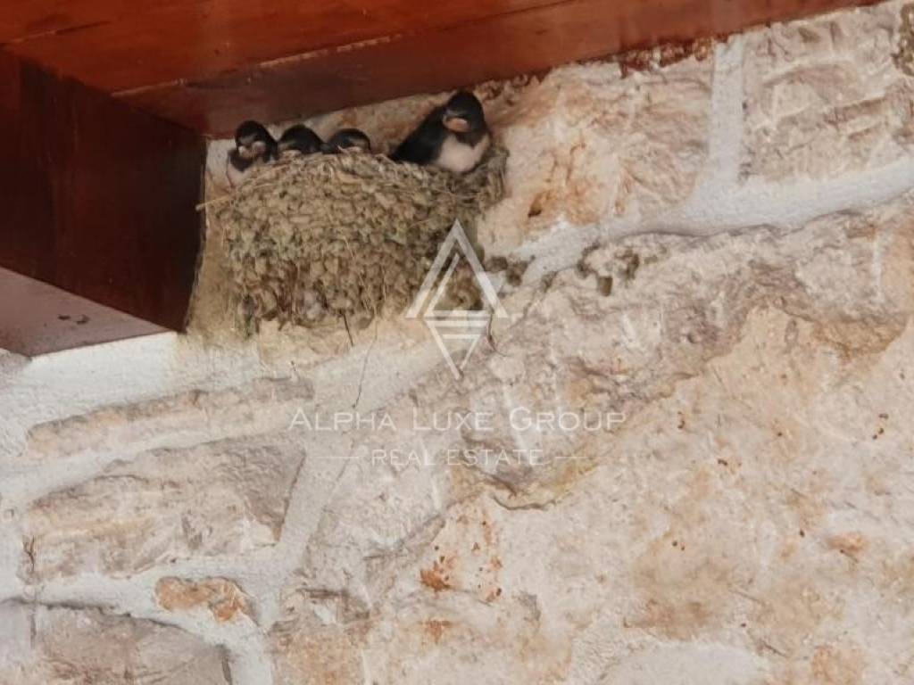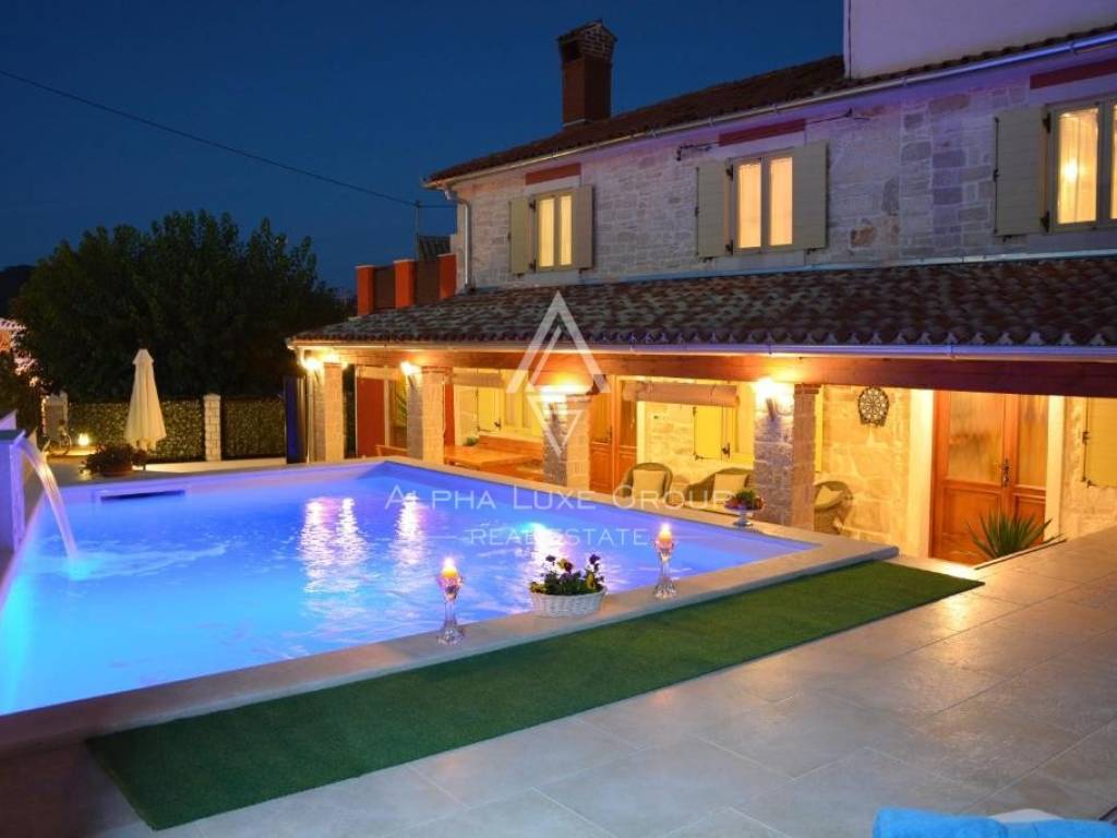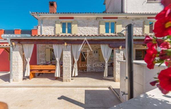 Una parte della casa è un’incantevole sezione in pietra finemente restaurata, estesa tra il piano terra e il primo piano. Ristrutturata con grande attenzione per mantenere il suo autentico fascino istriano, offre interni caldi arricchiti da dettagli in legno e pietra naturale. Questa unità comprende un luminoso soggiorno, una cucina con zona pranzo, un bagno per gli ospiti, tre camere da letto, un bagno principale e un’ampia terrazza coperta che si apre su un cortile pavimentato con accesso diretto alla piscina.