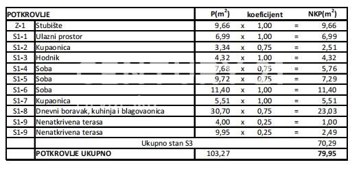 Si compone di scala, ingresso, 2 bagni (3,34 m2 + 5,51 m2), corridoio, 3 camere da letto (7,68 m2 + 9,72 m2 + 11,40 m2), soggiorno con cucina e sala da pranzo di 30,70 m2, terrazza scoperta di 9,95 m2 (2,49 m2) e seconda terrazza scoperta di 4,00 m2 netti 1,00 m2.