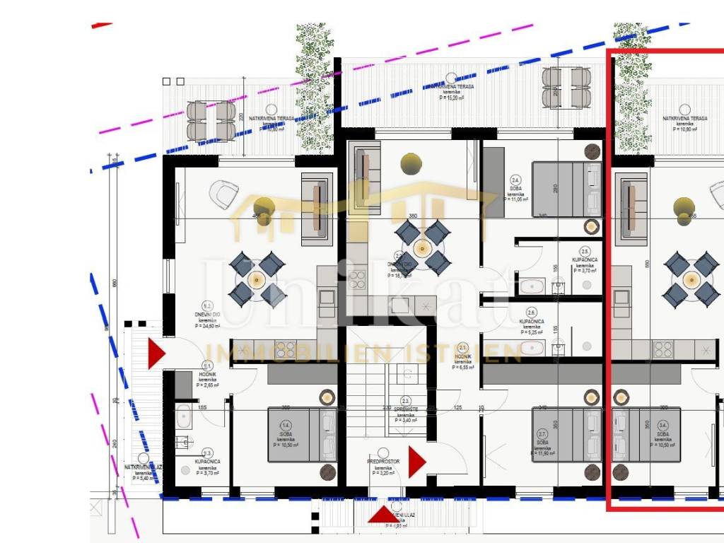 L'appartamento si trova al piano terra ed è composto da un ingresso, soggiorno open space con cucina e zona pranzo, una camera da letto, un bagno e una terrazza coperta. Inoltre, all'appartamento appartiene un piccolo giardino e per tutti i residenti è disponibile una piscina ad uso comune.