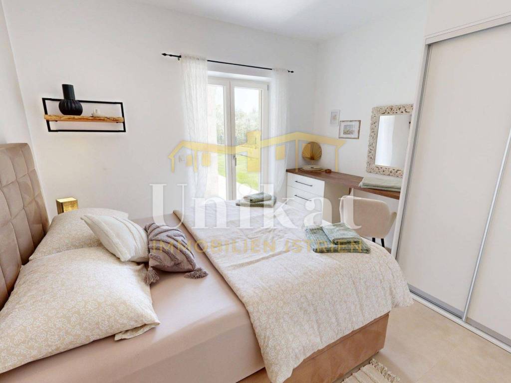 Al piano terra si trovano un ampio soggiorno open space con cucina e sala da pranzo, una camera da letto con bagno privato, un WC separato per gli ospiti e un ripostiglio. Da tutte le stanze si accede direttamente alla terrazza parzialmente coperta, situata accanto alla piscina e all’area solarium.