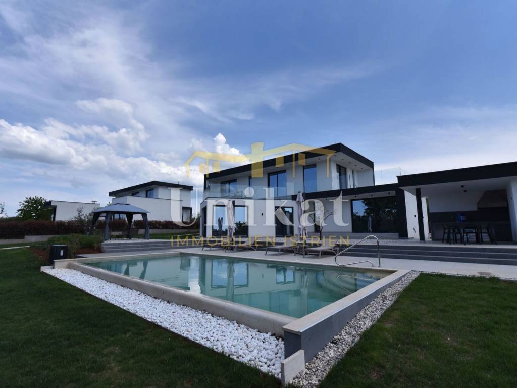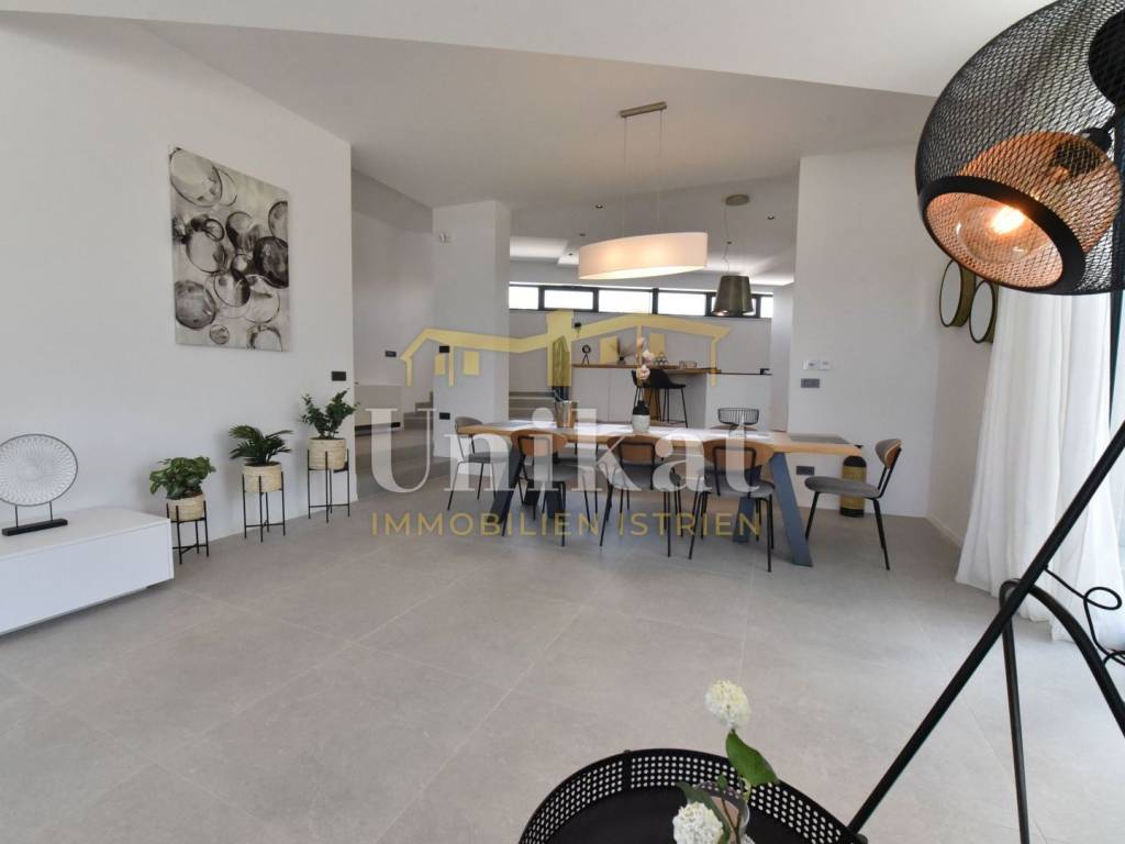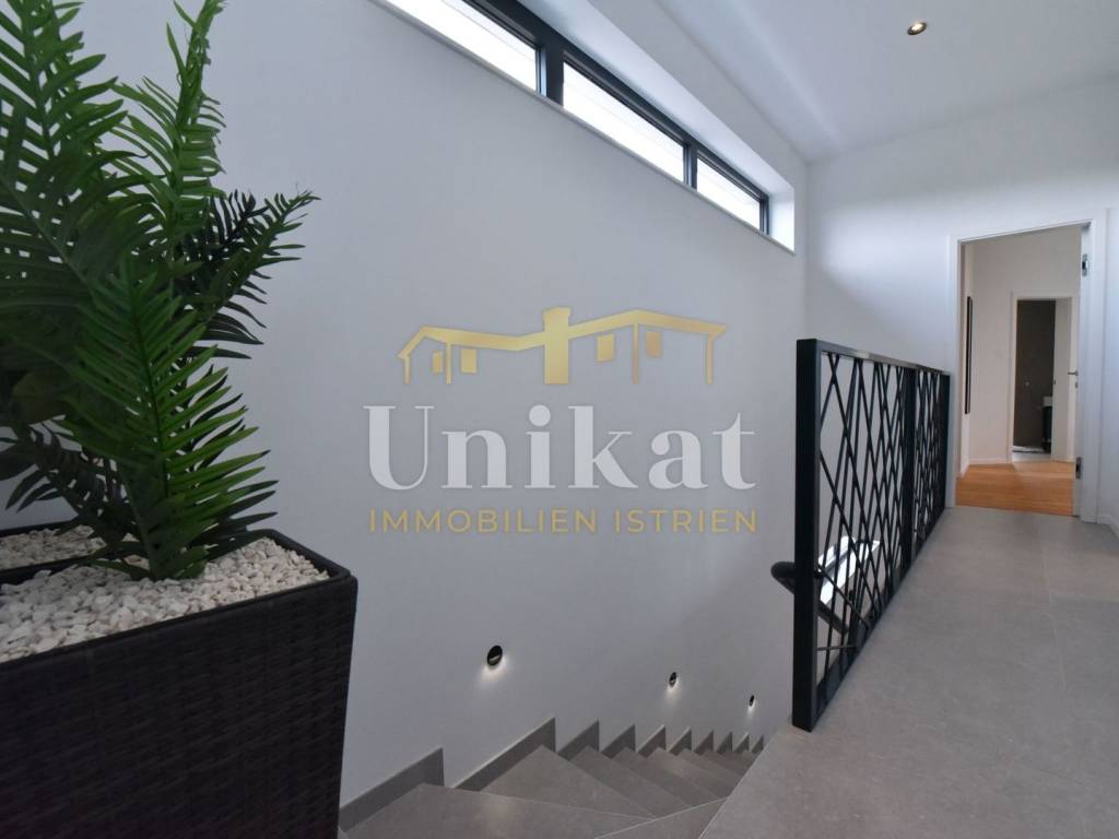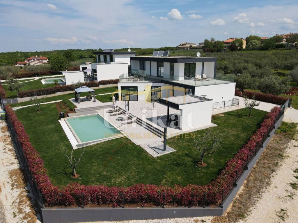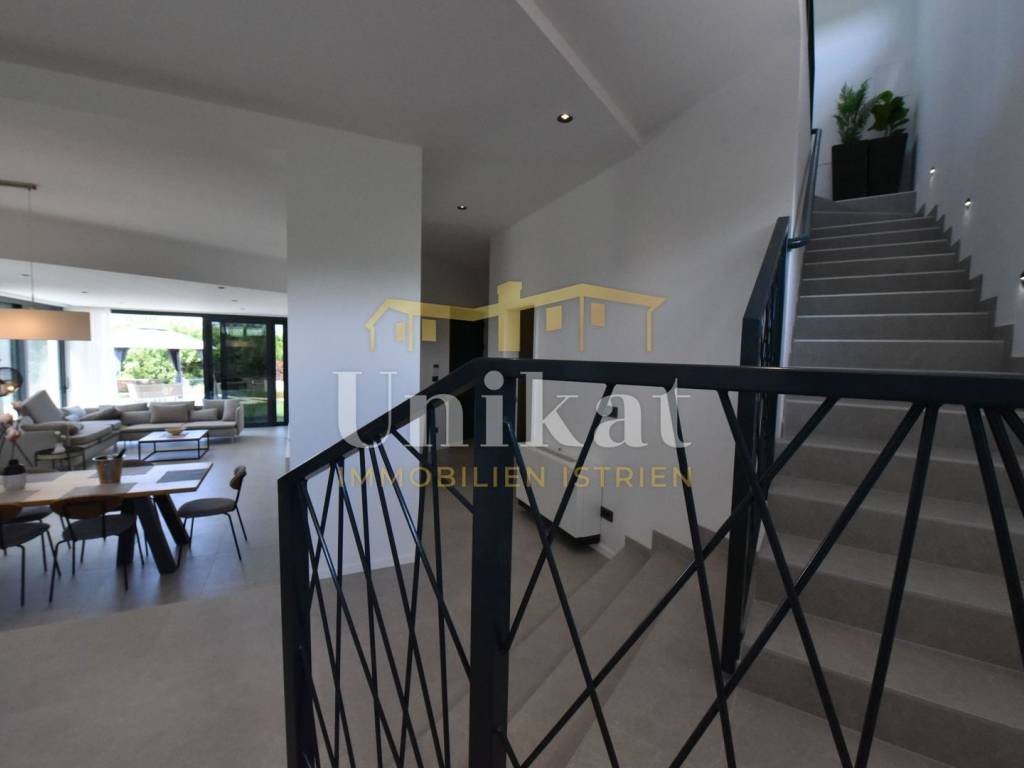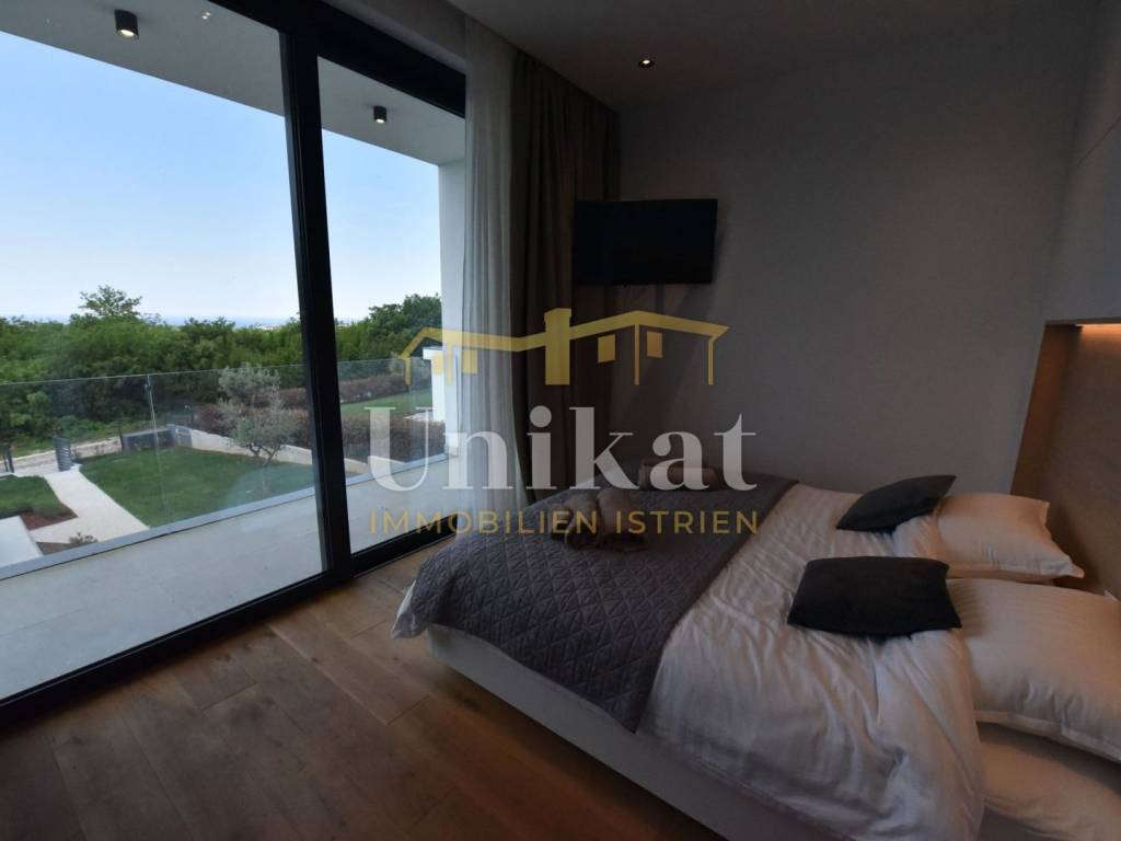 Imponente villa con vista panoramica sul mare e sul verde. Al piano terra è composta da un ampio soggiorno, cucina e sala da pranzo, una camera da letto con bagno, un WC per gli ospiti, lavanderia, sala fitness e zona benessere con sauna e doccia. Al piano superiore si trovano altre tre camere da letto, ciascuna con il proprio bagno, e un ampio terrazzo esterno con jacuzzi. La villa è dotata di aria condizionata, riscaldamento a pavimento e pannelli solari per l’acqua calda. Viene venduta arredata.