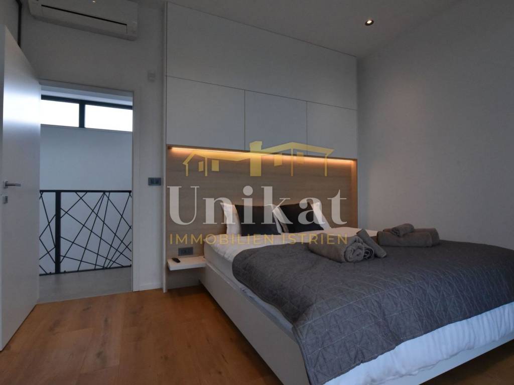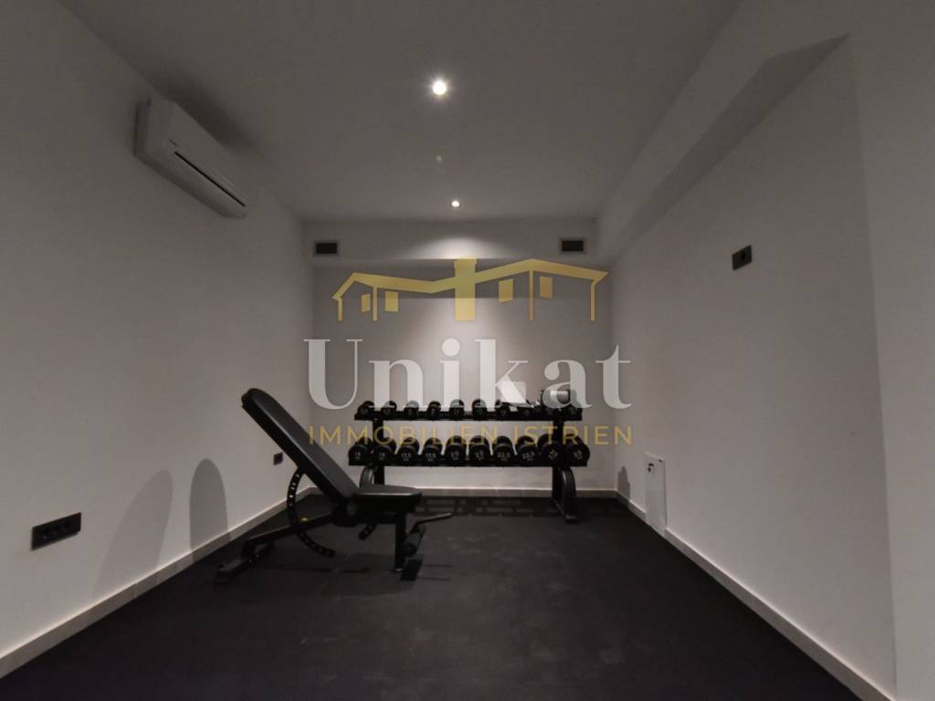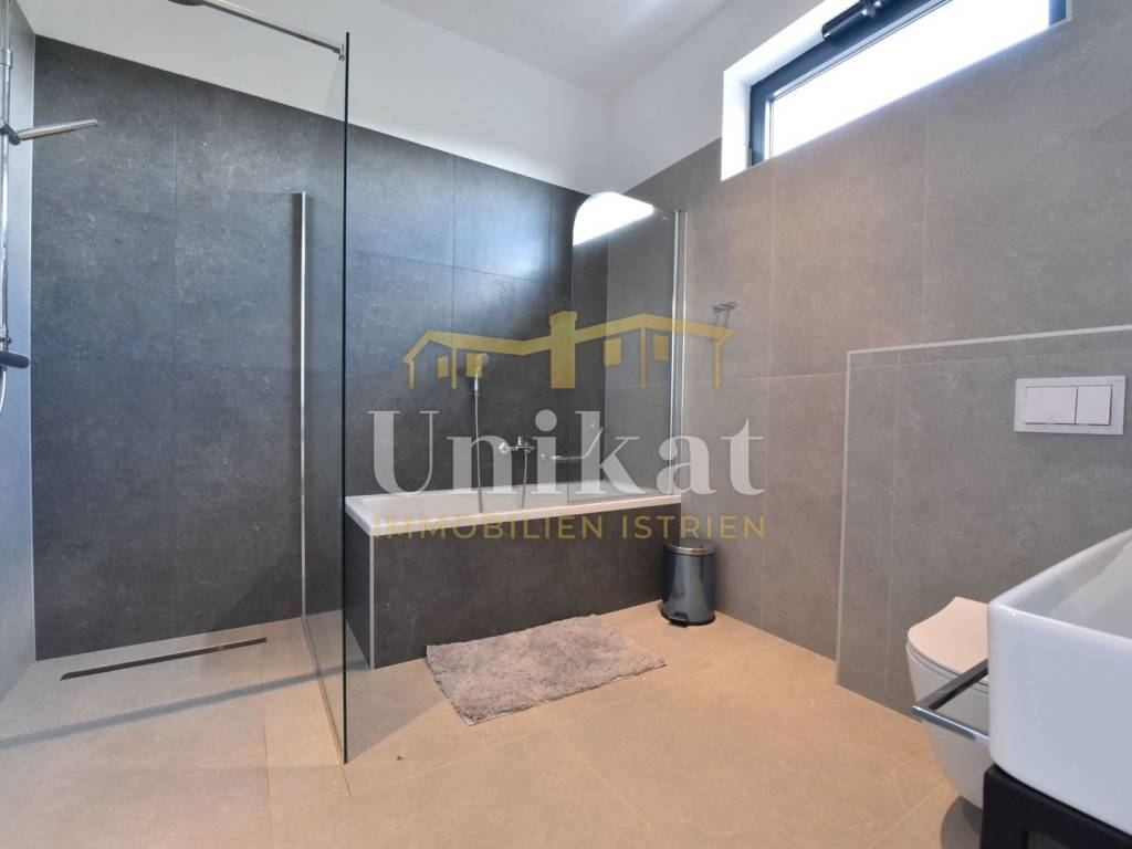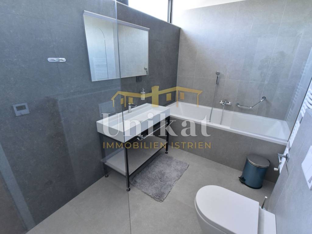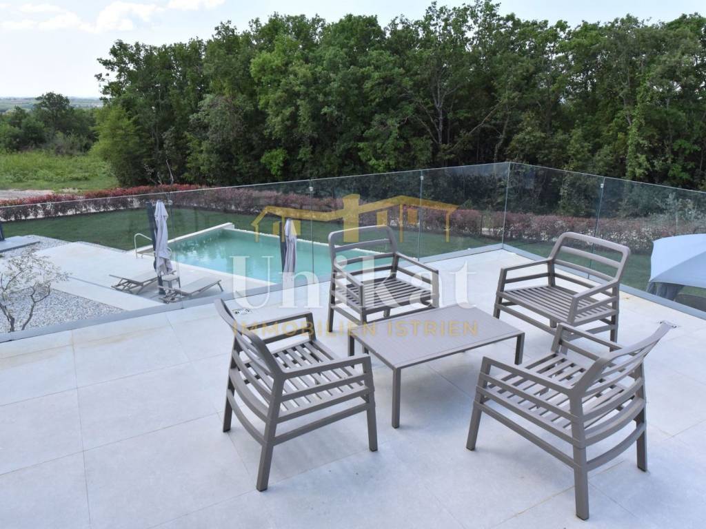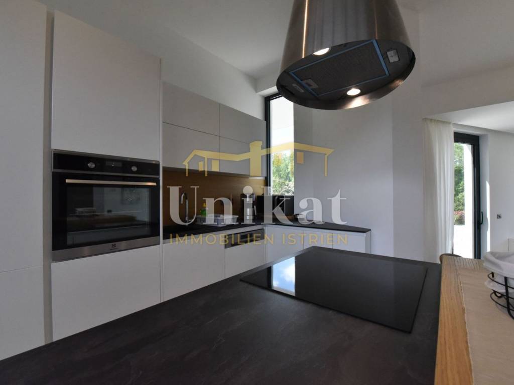 Imponente villa con vista panoramica sul mare e sul verde. Al piano terra è composta da un ampio soggiorno, cucina e sala da pranzo, una camera da letto con bagno, un WC per gli ospiti, lavanderia, sala fitness e zona benessere con sauna e doccia. Al piano superiore si trovano altre tre camere da letto, ciascuna con il proprio bagno, e un ampio terrazzo esterno con jacuzzi. La villa è dotata di aria condizionata, riscaldamento a pavimento e pannelli solari per l’acqua calda. Viene venduta arredata.