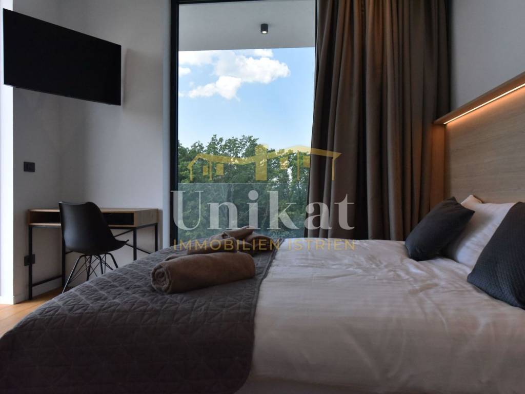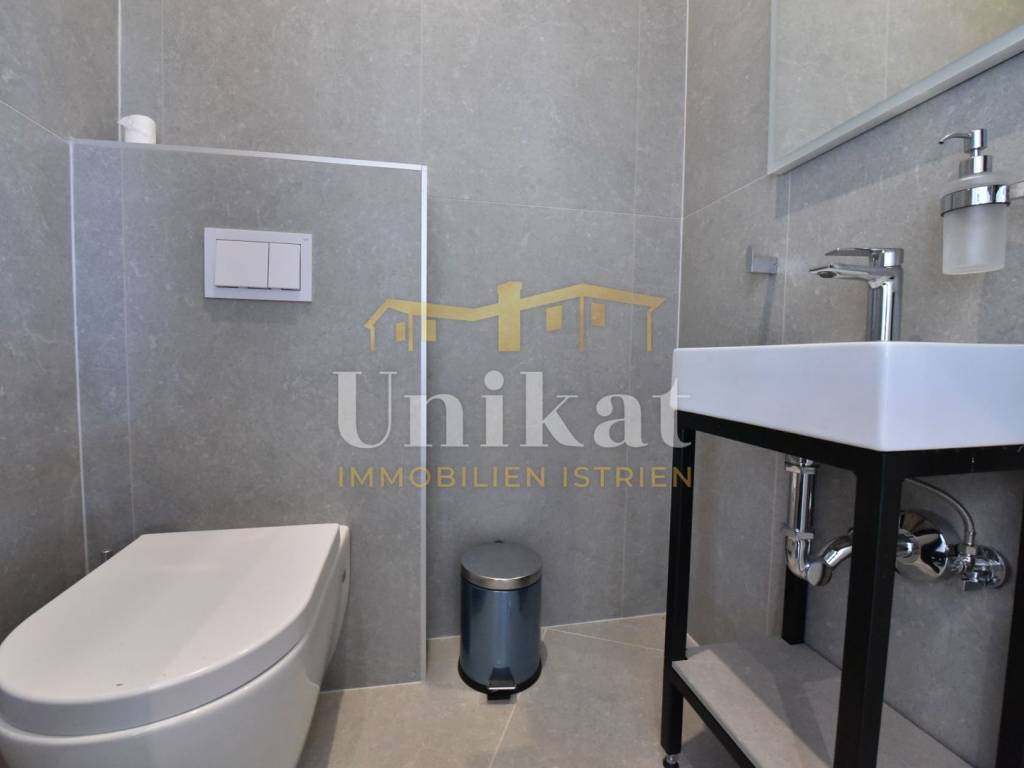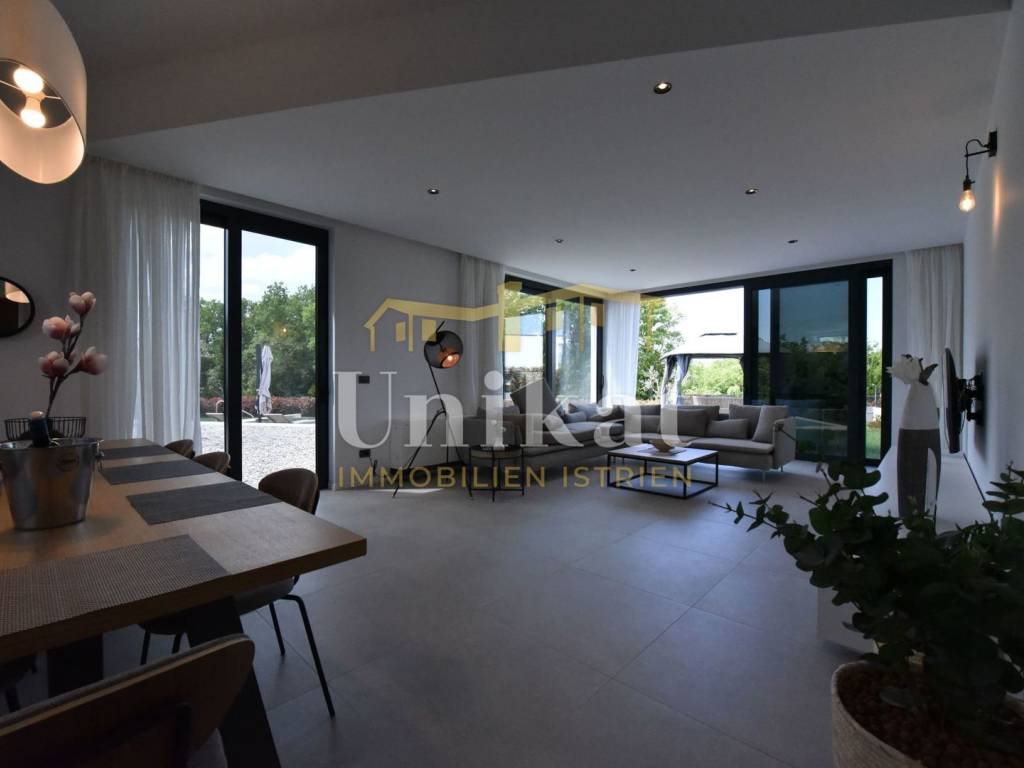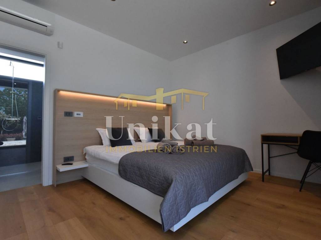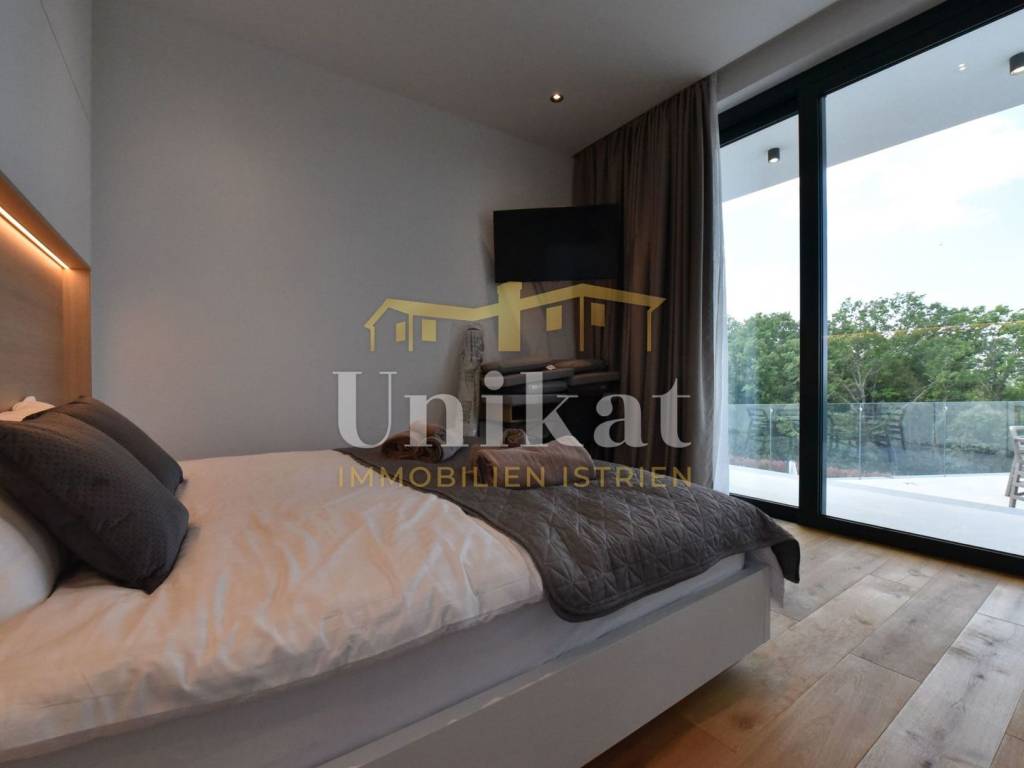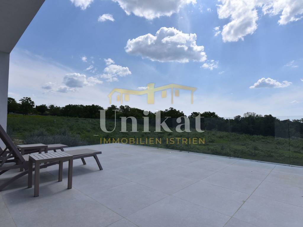 Imponente villa con vista panoramica sul mare e sul verde. Al piano terra è composta da un ampio soggiorno, cucina e sala da pranzo, una camera da letto con bagno, un WC per gli ospiti, lavanderia, sala fitness e zona benessere con sauna e doccia. Al piano superiore si trovano altre tre camere da letto, ciascuna con il proprio bagno, e un ampio terrazzo esterno con jacuzzi. La villa è dotata di aria condizionata, riscaldamento a pavimento e pannelli solari per l’acqua calda. Viene venduta arredata.