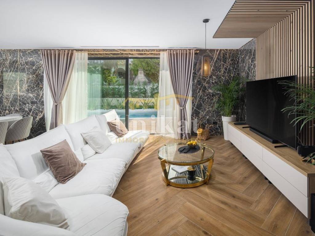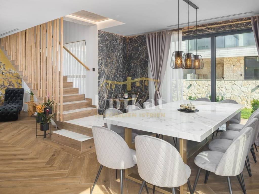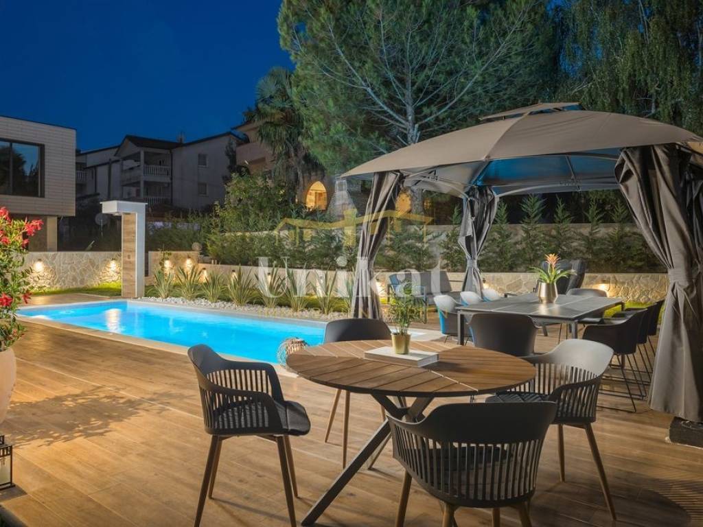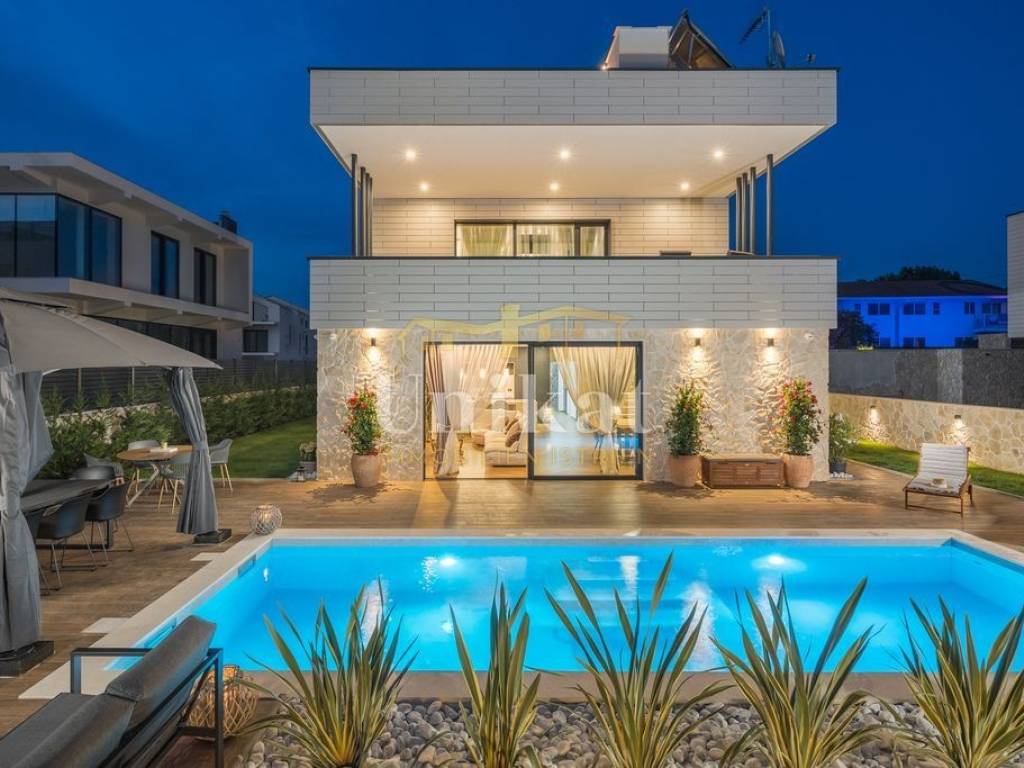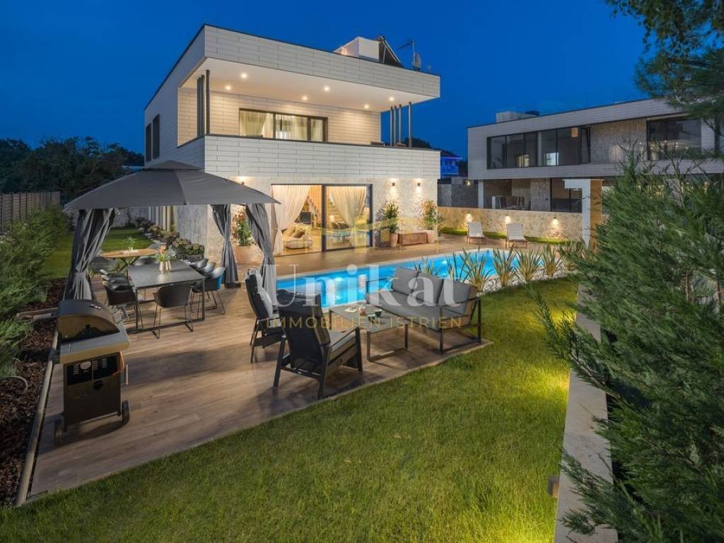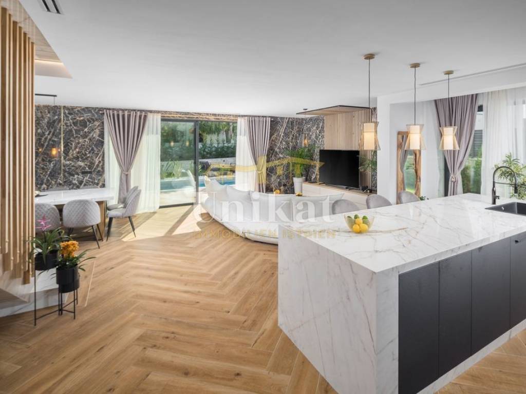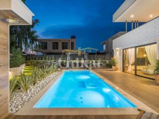 Imponente villa moderna a soli 400 metri dal mare e dalle prime spiagge. Al piano terra della villa si trovano l’ingresso, un ampio soggiorno, cucina e sala da pranzo, locale tecnico, due camere da letto e due bagni, mentre al piano superiore ci sono altre tre camere da letto, ciascuna con il proprio bagno e una terrazza coperta di 30 m². Nel giardino si trovano anche una piscina di 30 m², un giardino e tre posti auto. La villa viene venduta prevalentemente arredata.