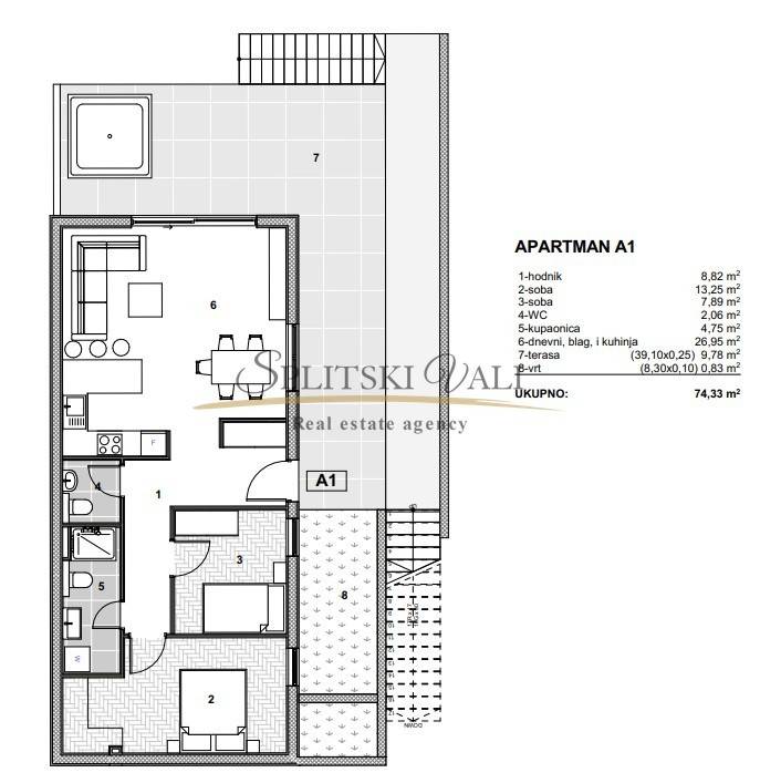 Stan se sastoji od hodnika, dvije spavaće sobe, kupaonice, zasebnog WC-a, kuhinje s blagovaonicom te dnevnog boravka s izlazom na terasu površine 39,10 m, uz pripadajući vrt površine 8,30 m. Tlocrt stana priložen je u sklopu oglasa.