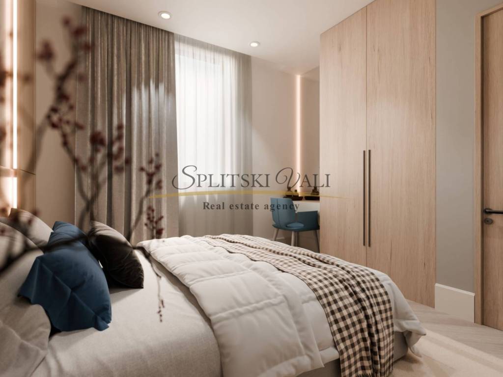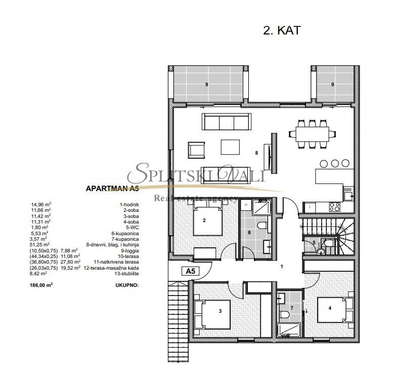 Stan se sastoji od hodnika, tri spavaće sobe, dvije kupaonice, zasebnog WC-a, kuhinje s blagovaonicom te dnevnog boravka s izlazom na loggiu i krovnu terasu. Tlocrt stana priložen je u sklopu oglasa.