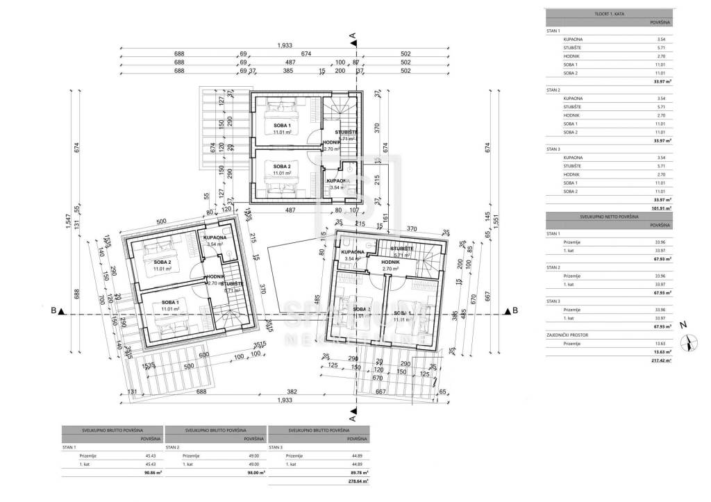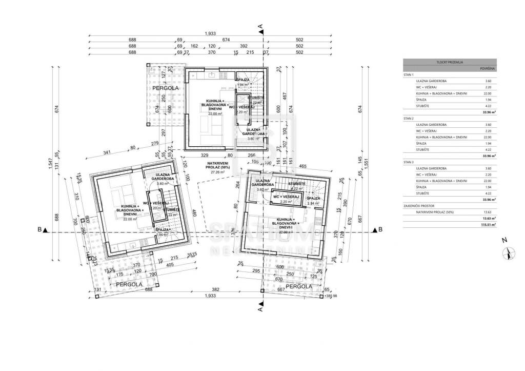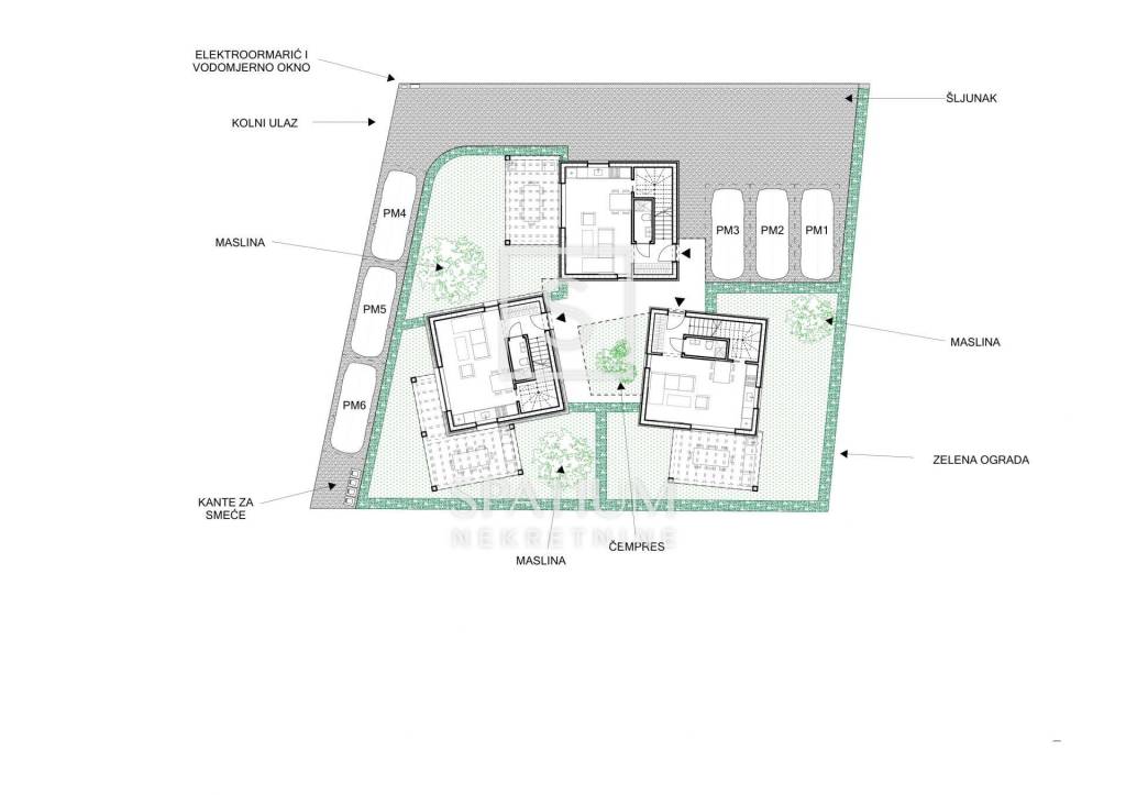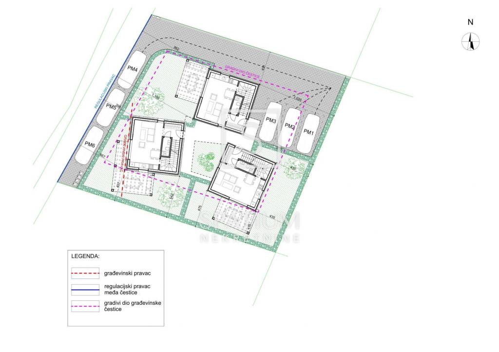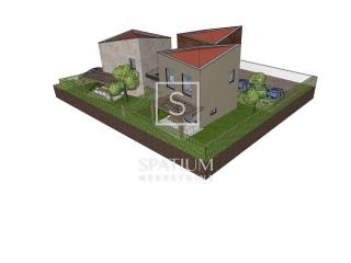 Per il terreno è stato elaborato un progetto preliminare per la realizzazione di un edificio residenziale con tre unità abitative. Ogni unità è progettata su due livelli, con un piano terra funzionalmente organizzato che comprende guardaroba d’ingresso, WC con lavanderia e zona giorno open space con cucina e sala da pranzo, oltre a un locale ripostiglio. Al piano superiore si trovano due camere da letto, un bagno e un disimpegno. La superficie netta di ciascuna unità abitativa è di circa 68 m².
