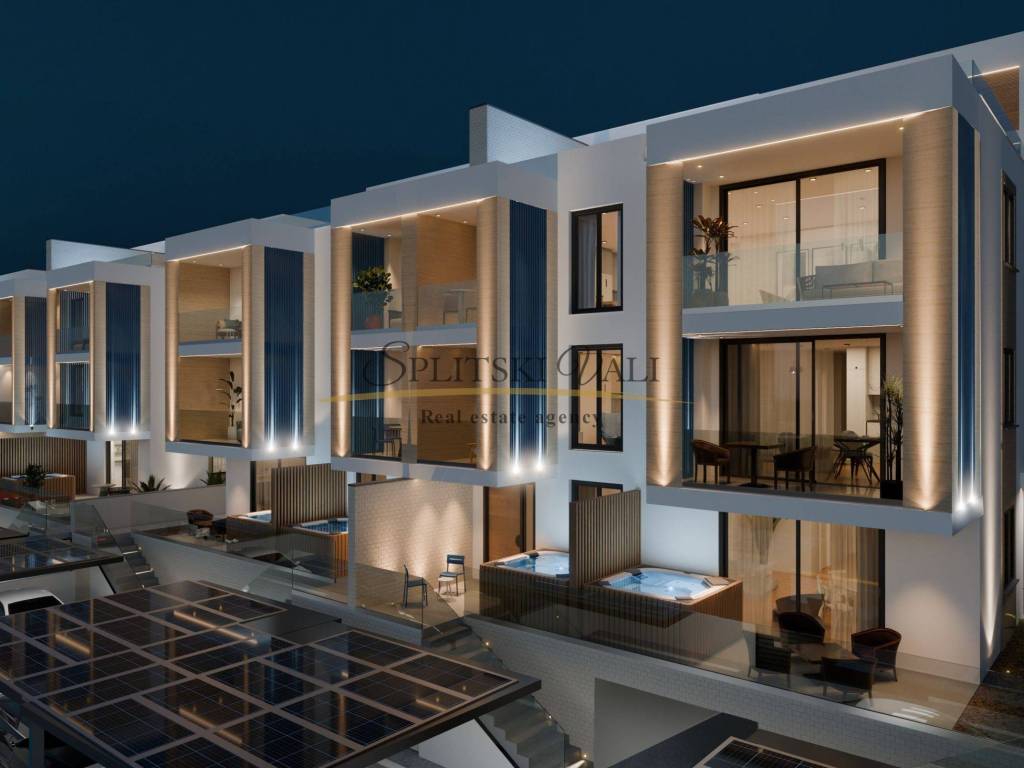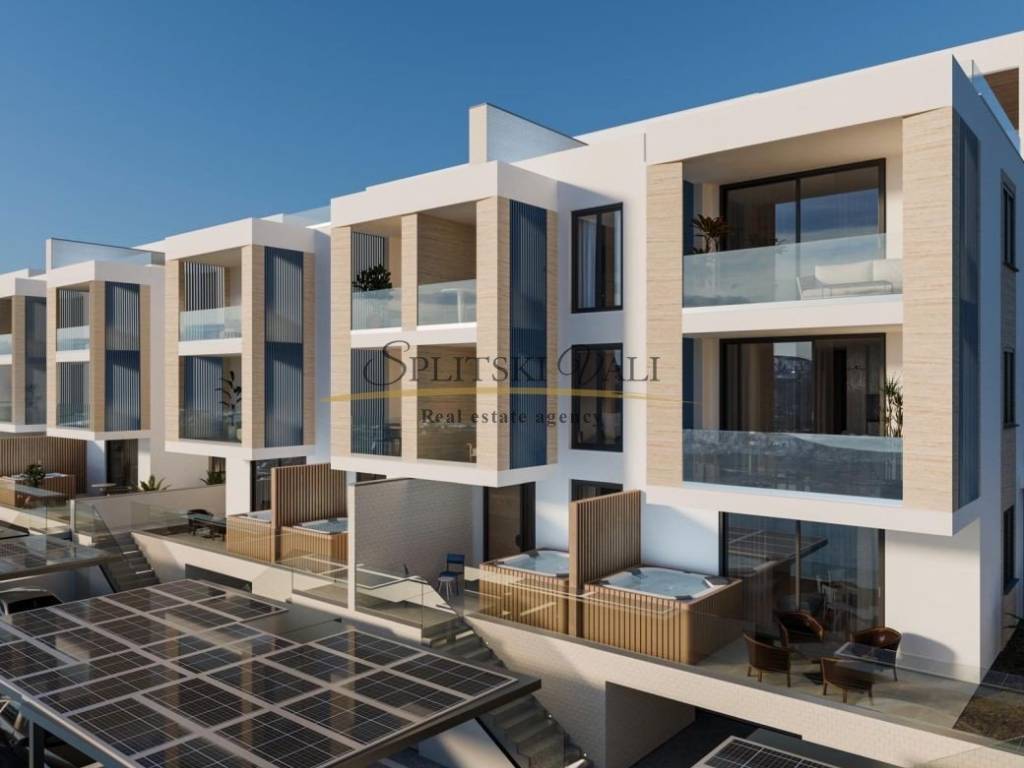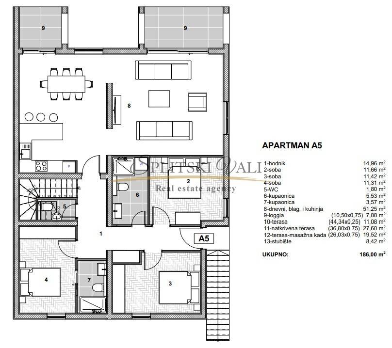 Neto stambena površina iznosi 111,50 m, dok ukupna bruto površina s krovnom terasom iznosi 186,00 m. U cijenu su uključena dva otvorena parkirna mjesta.