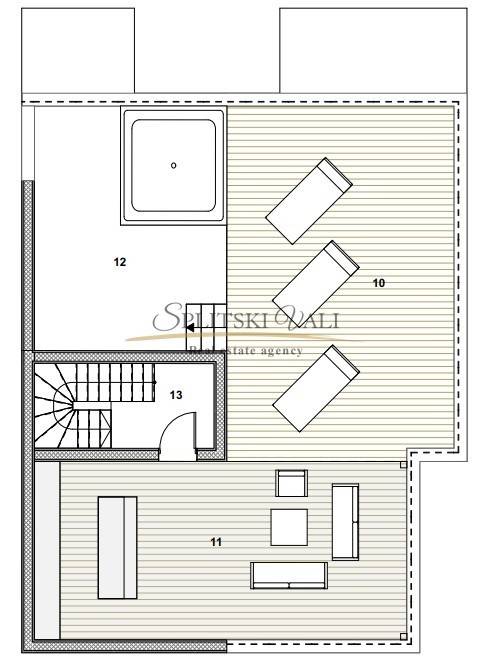 Stan se sastoji od ulaznog hodnika, tri spavaće sobe, dvije kupaonice, dodatnog WC-a te kuhinje povezane s blagovaonicom i dnevnim boravkom, iz kojeg se izlazi na terasu i lođu. Krovna terasa s bazenom predstavlja dodatnu vrijednost stana i prostor pogodan za boravak na otvorenom.