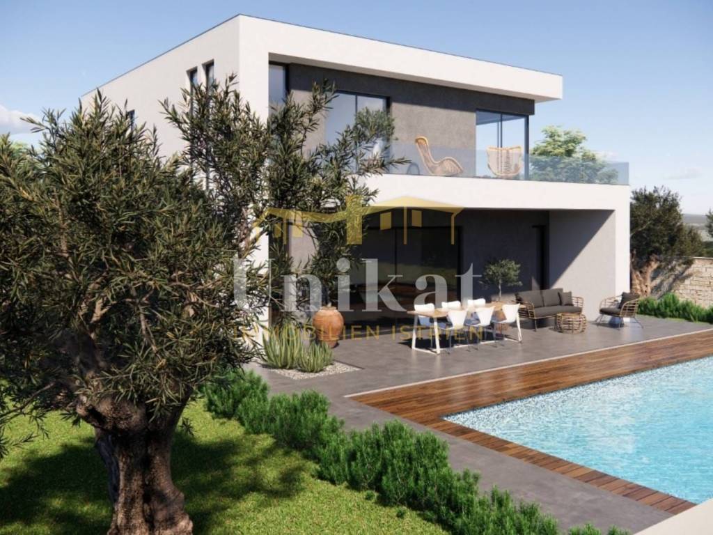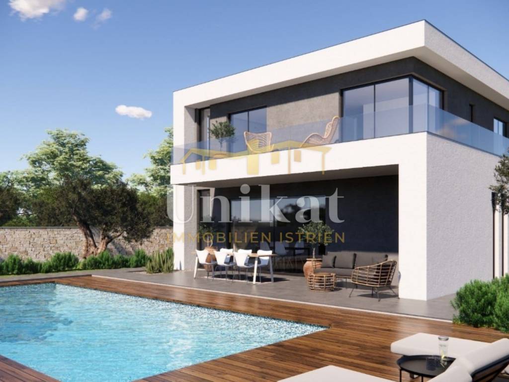 Davanti alla casa è previsto un parcheggio per due veicoli, mentre dietro la casa si trova la piscina con solarium e un giardino curato. L’intero terreno sarà recintato.