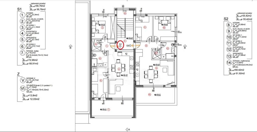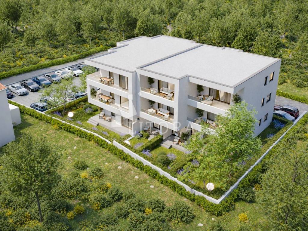Brodarica – new construction. The residential building is located in a peaceful environment, close to all public amenities. In building K2, there is apartment S1, with a total usable area of 73,91 m², including a parking, situated in the 1st floor. The apartment has an interior area of 68,91 m² and consists of an entrance hall, two bedrooms, a bathroom, storage a kitchen with a dining area, and a living room with access to a spacious terrace of 16,20m². The apartment also includes two parking spaces with a total area of 25 m².