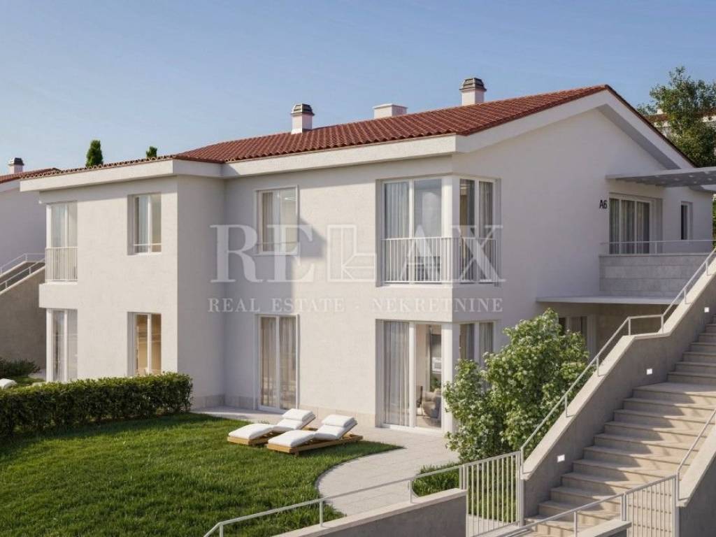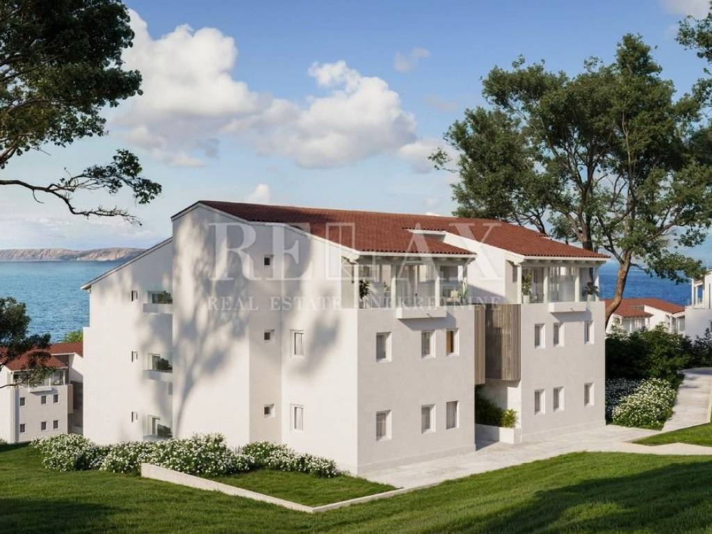 In vendita un lussuoso appartamento con una camera da letto situato al piano terra di un edificio in seconda fila dal mare, all'interno di un resort premium a Novi Vinodolski. L'appartamento, con una superficie totale di 59,12 m², è composto da un soggiorno open space con cucina e zona pranzo, una camera da letto, un bagno, ingresso e un balcone con vista sul paesaggio curato e sul verde del resort.