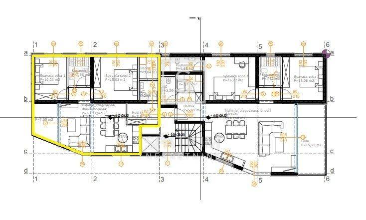 L'appartamento "A" si trova al piano terra dell'edificio, con una superficie netta totale di 82 m², con una disposizione ben progettata composta da un ingresso, due camere da letto, un bagno, un bagno per gli ospiti con lavanderia e un soggiorno open space con cucina e sala da pranzo.