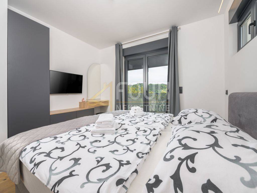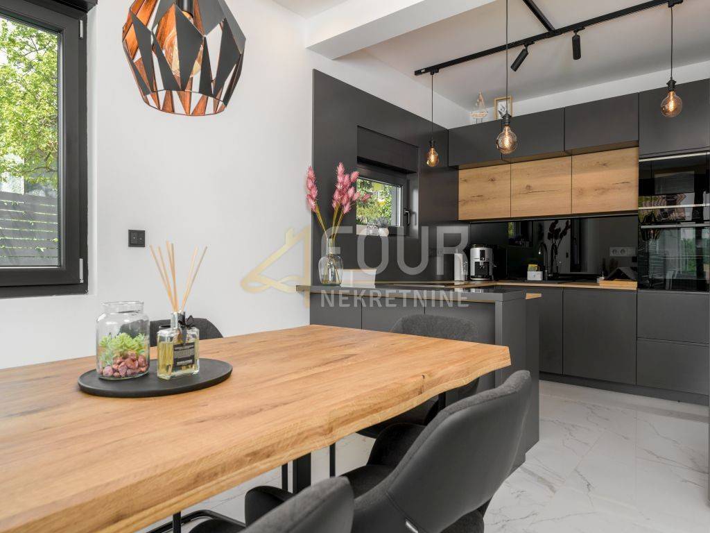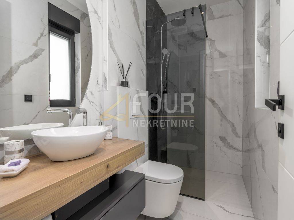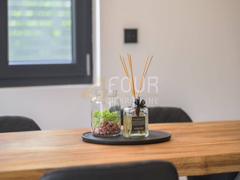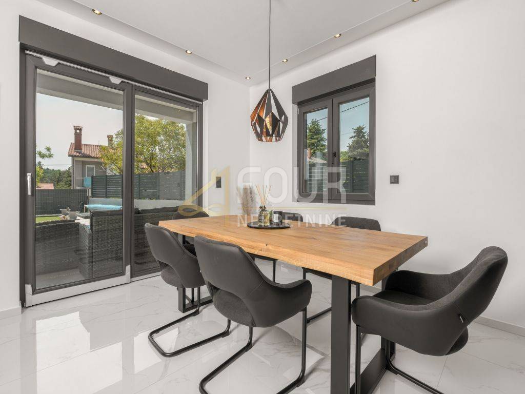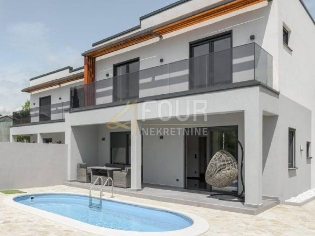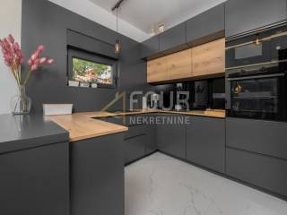 A prefabricated house with a swimming pool and a view of the old town is for sale in the center of Labin. The house has 130m2 of living space and consists of a ground floor and a first floor. On the ground floor of the house there is a spacious living room, a kitchen with a dining room, a bathroom, a storage room and a covered terrace. There are three bedrooms, a bathroom and a terrace on the first floor. The house is equipped with top quality furniture and household appliances. The bathrooms have underfloor heating. There is a swimming pool with a sun deck on the 370m2 garden.