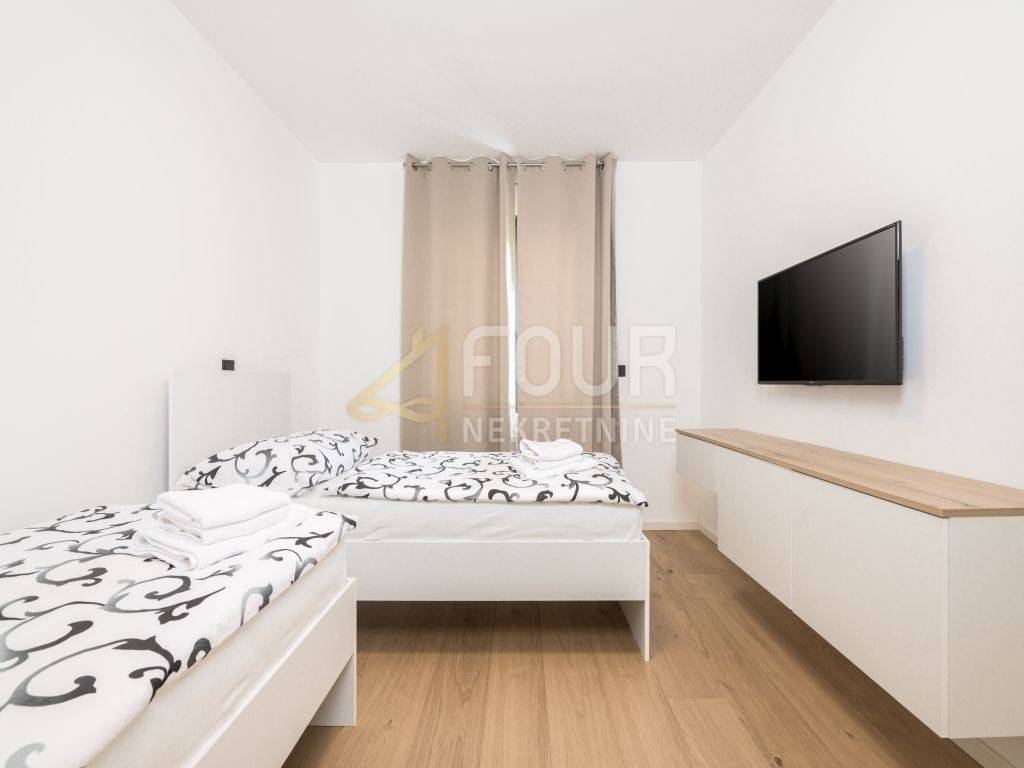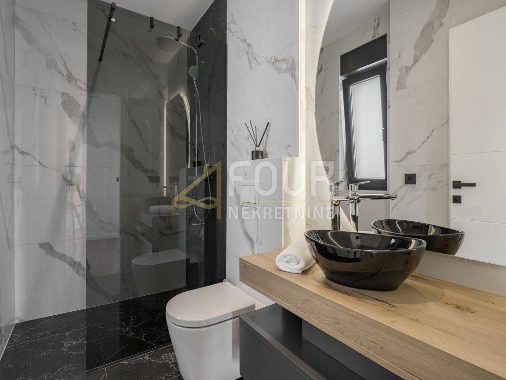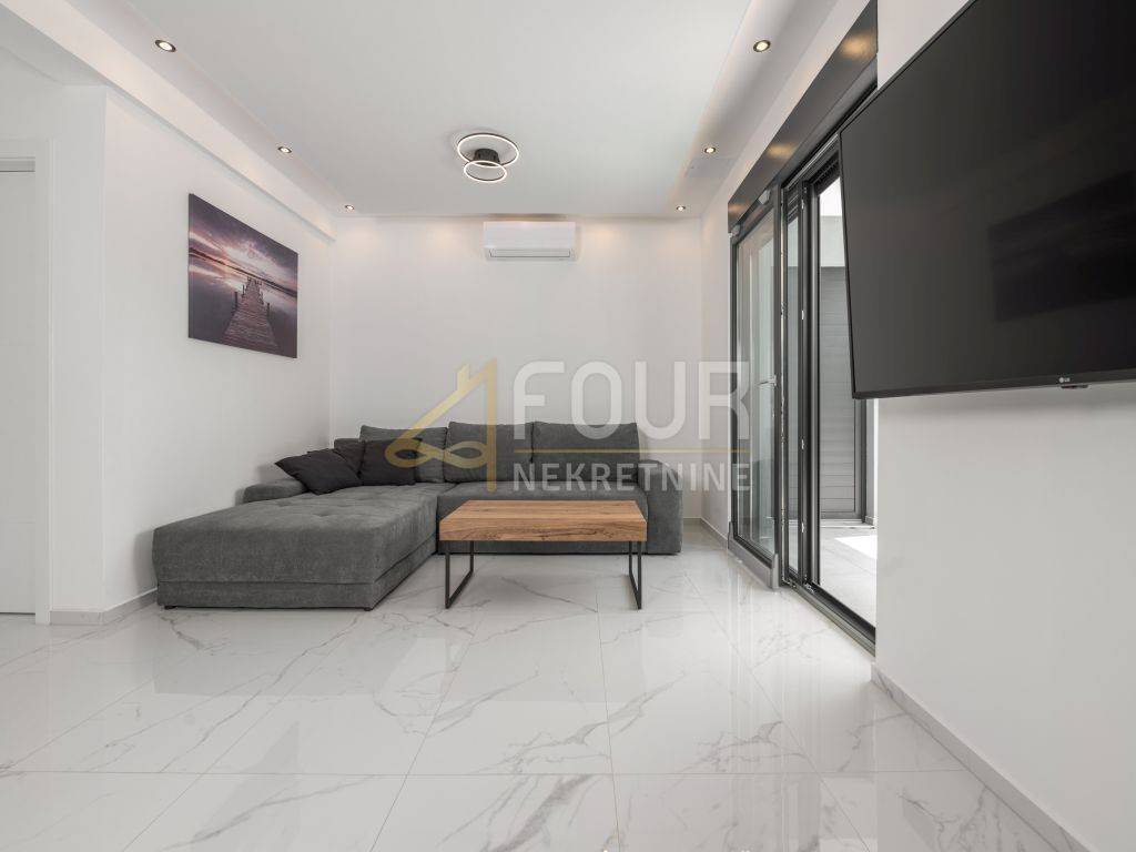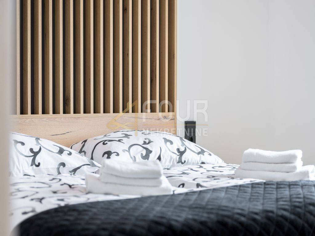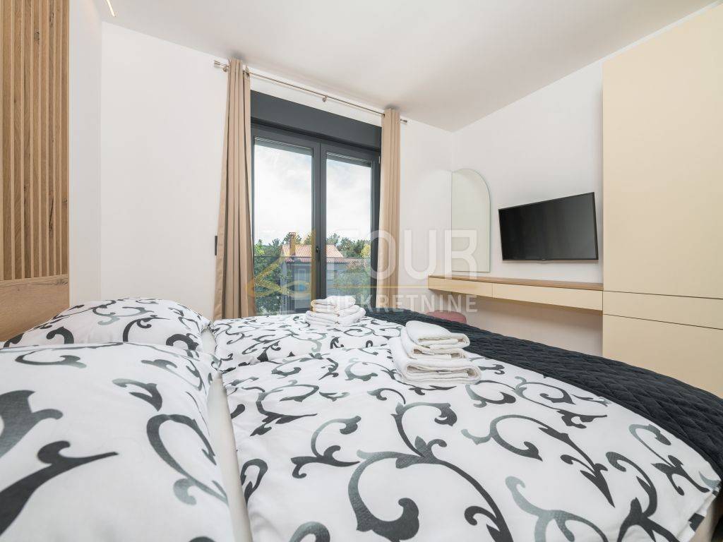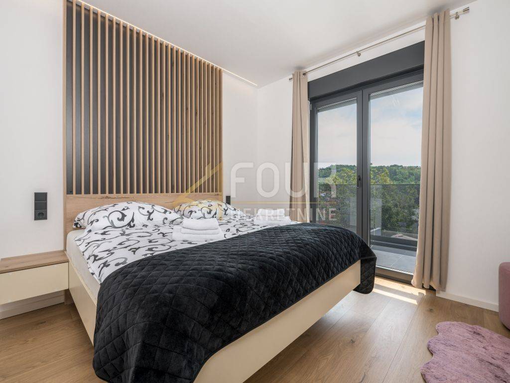 A prefabricated house with a swimming pool and a view of the old town is for sale in the center of Labin. The house has 130m2 of living space and consists of a ground floor and a first floor. On the ground floor of the house there is a spacious living room, a kitchen with a dining room, a bathroom, a storage room and a covered terrace. There are three bedrooms, a bathroom and a terrace on the first floor. The house is equipped with top quality furniture and household appliances. The bathrooms have underfloor heating. There is a swimming pool with a sun deck on the 370m2 garden.