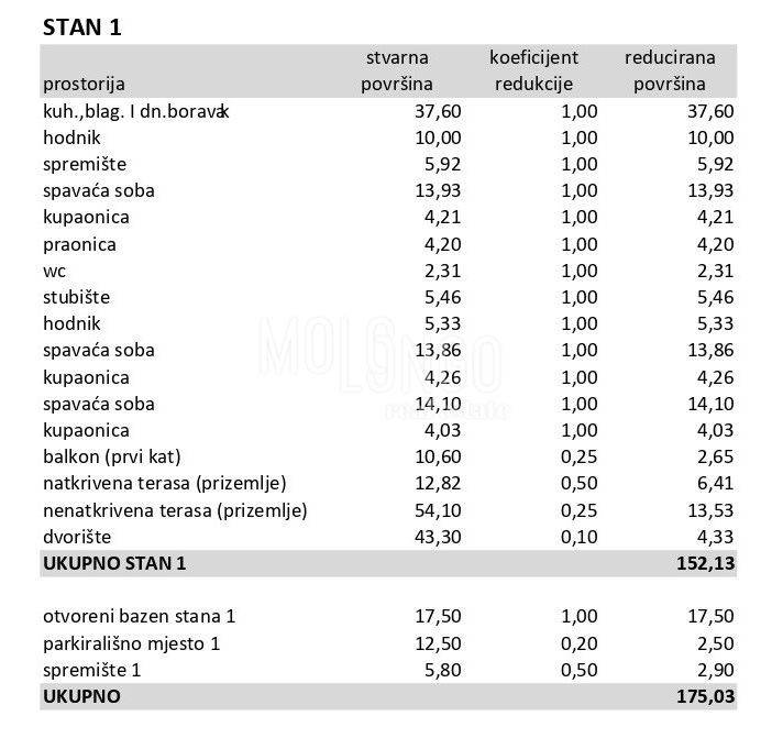 L'appartamento 1 con una superficie di 152,13 mq si estende su due piani: piano terra e primo piano. Al piano terra si trova un soggiorno open concept con cucina e sala da pranzo, dal quale si accede a due lati del cortile. Dal soggiorno si accede direttamente ad un bel terrazzo coperto di 12,82 mq e ad un terrazzo scoperto di 54 mq e ad una piscina di 17,50 mq. C'è anche un WC, una lavanderia e una camera da letto con bagno al piano terra. Al primo piano ci sono due camere da letto con il proprio bagno e accesso al balcone di 10,60 mq.