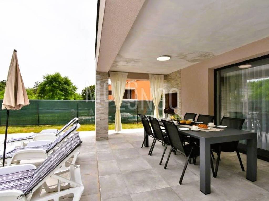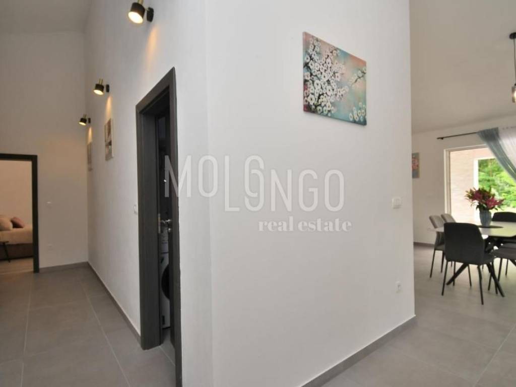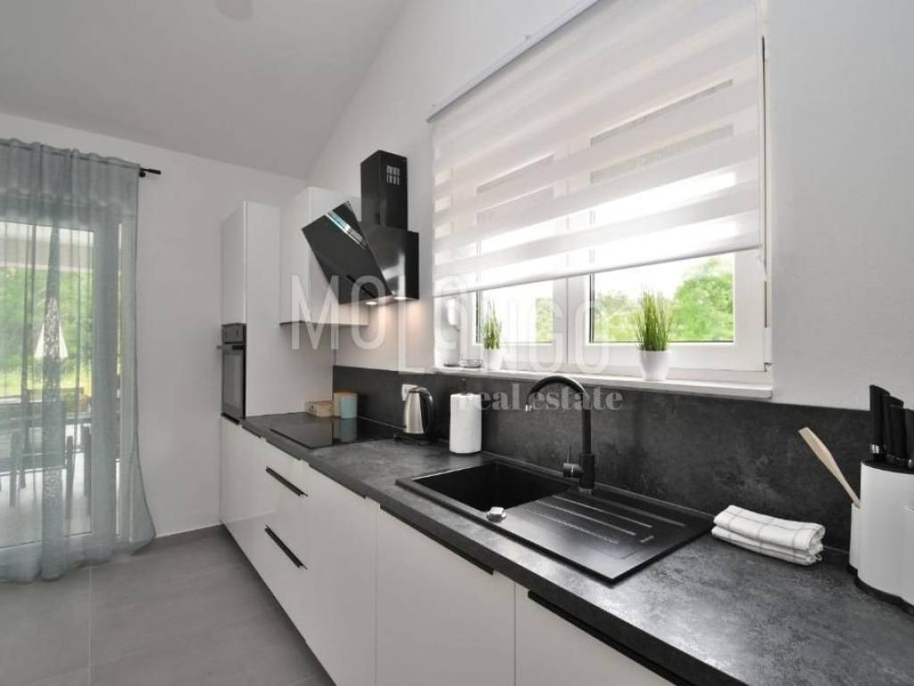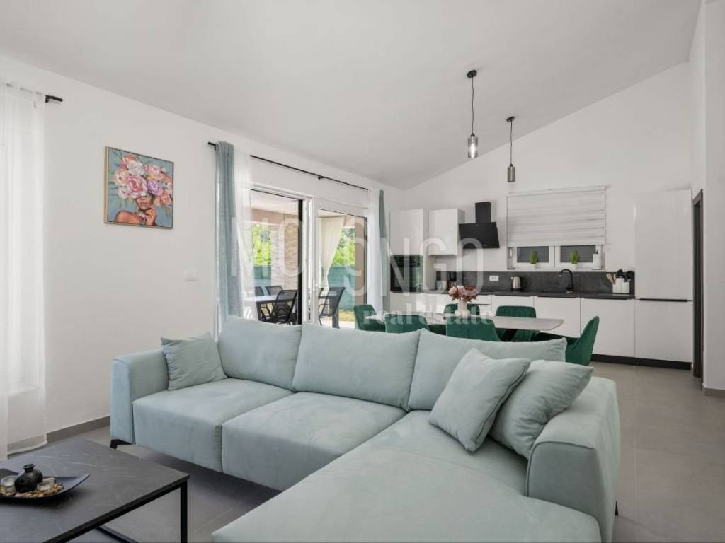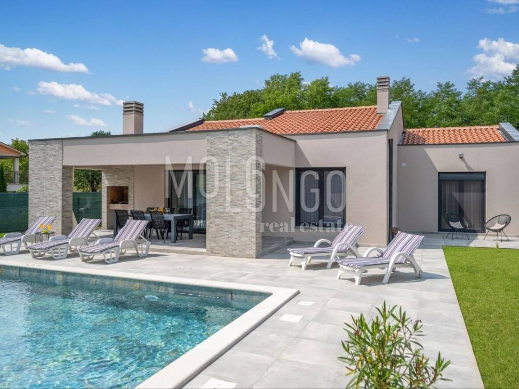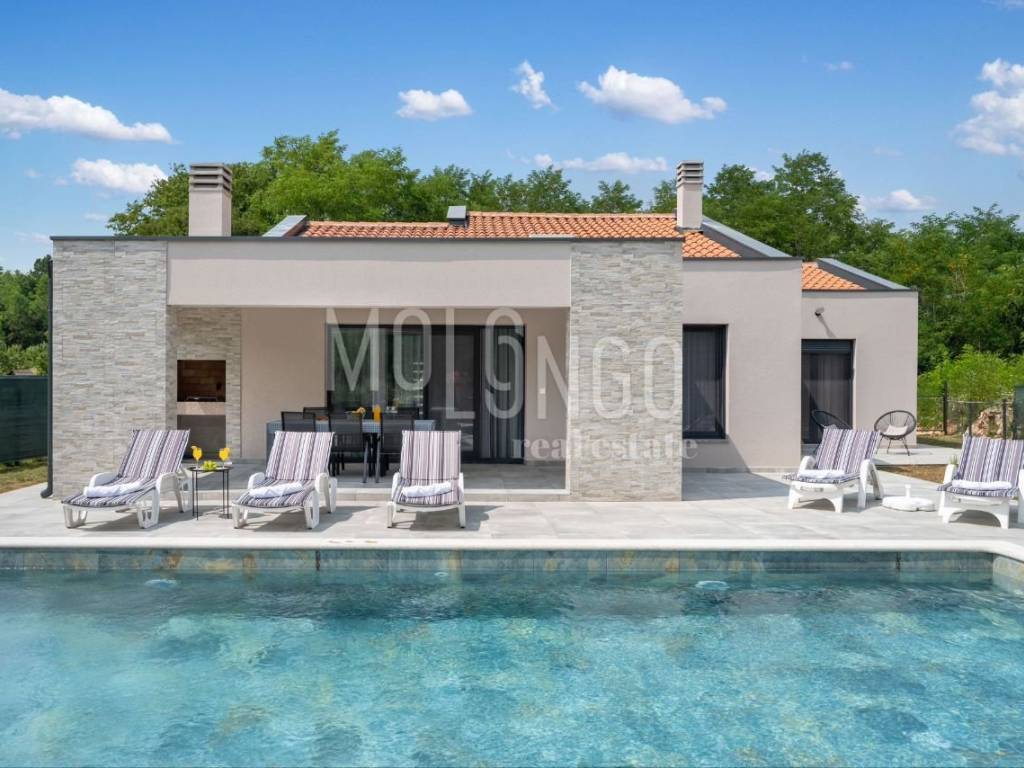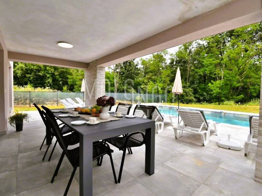 È in vendita una nuova casa con piscina, situata in una zona tranquilla vicino a Labin. La casa è circondata da una natura lussureggiante, offrendo un ambiente rilassante e una splendida vista.