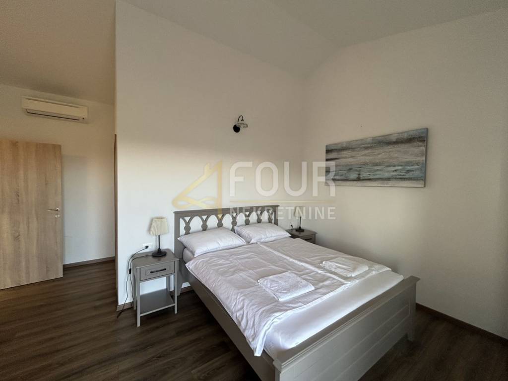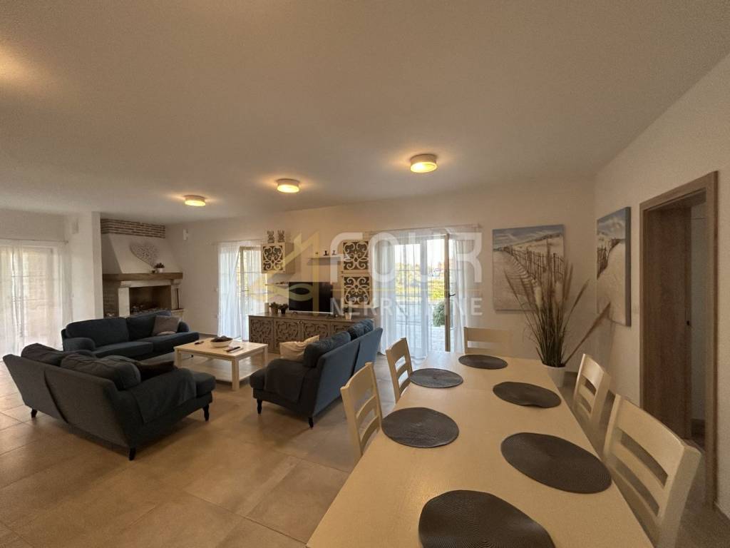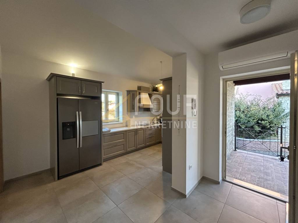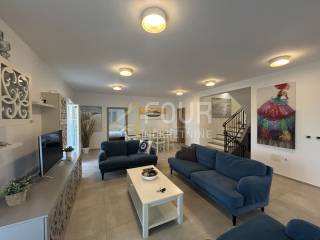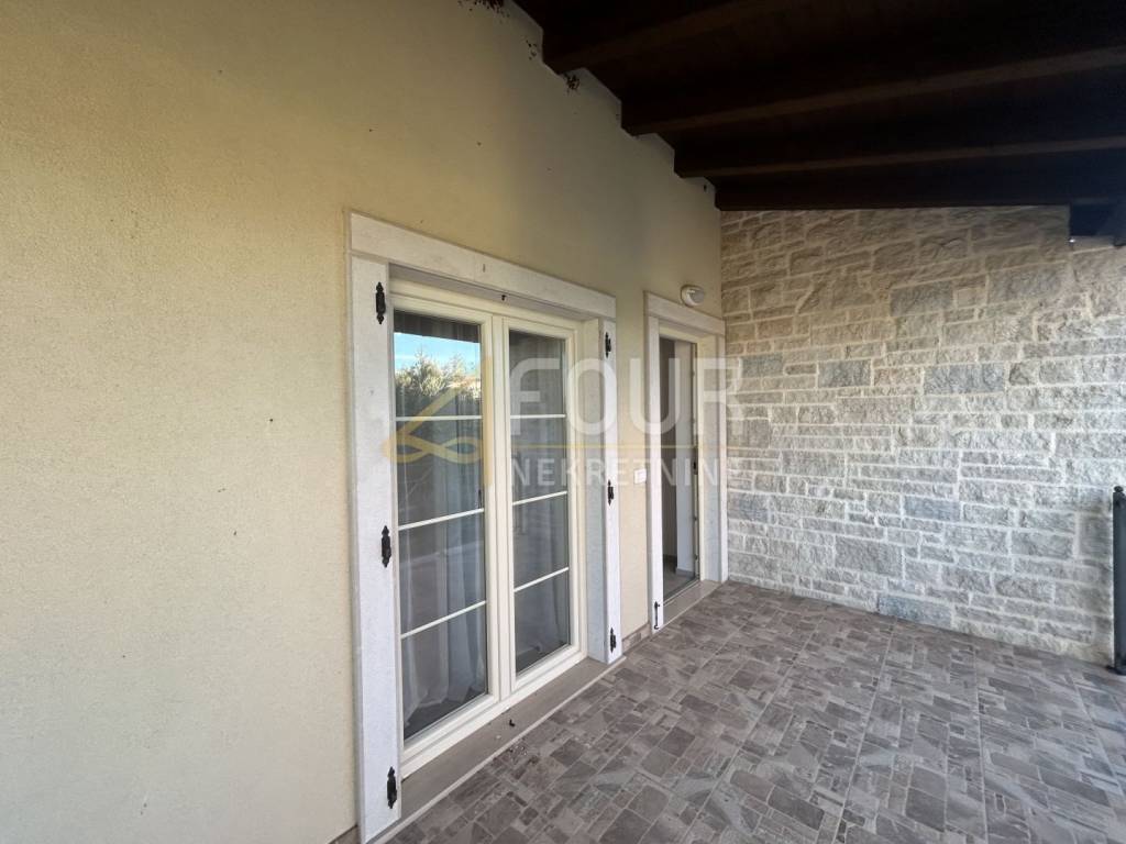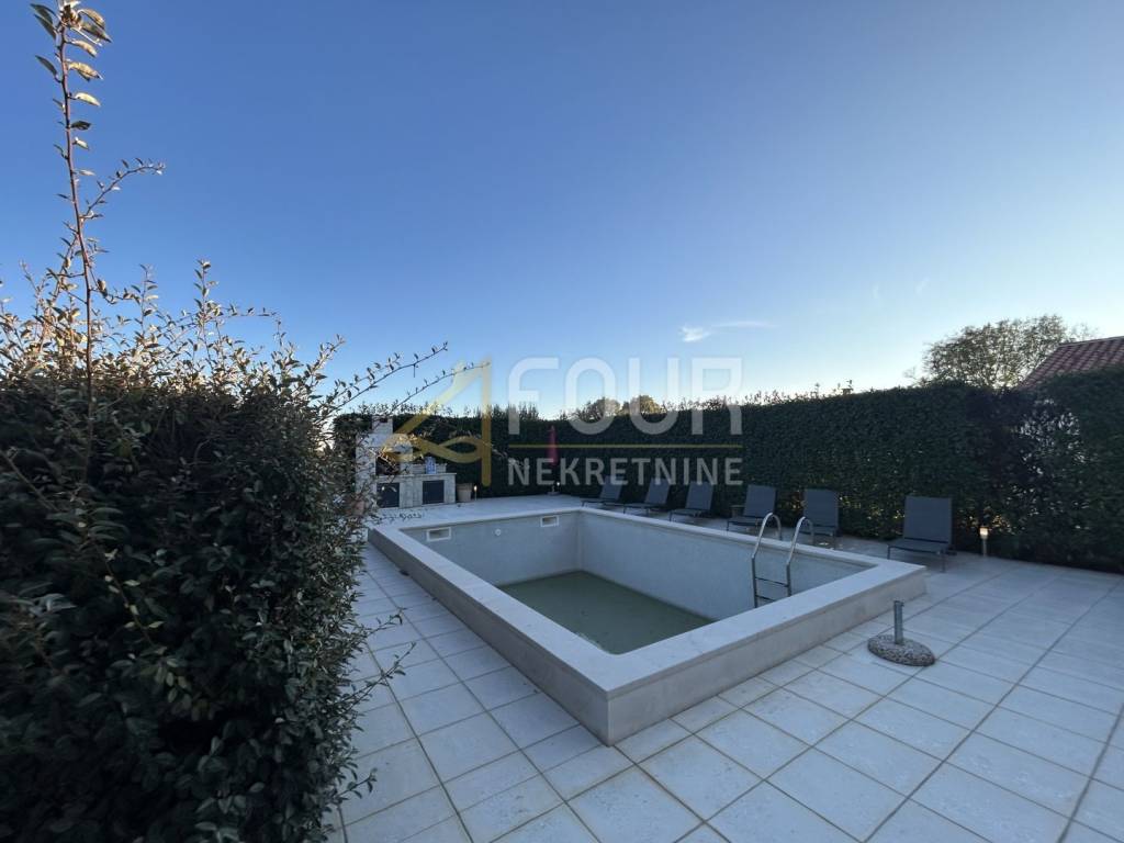 Non lontano da Barbana, si vende una casa indipendente di moderna architettura mediterranea, costruita nel 2013. Situata su un ampio terreno di 836 m2 con giardino curato, piscina e più posti auto.