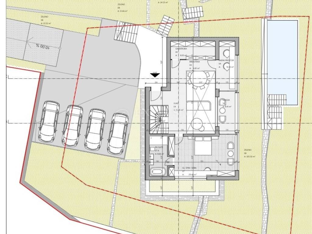 Zemljište se prodaje s projektom za samostojeću vilu S +P+1 bruto površine 432m2 i s infinity bazenom.