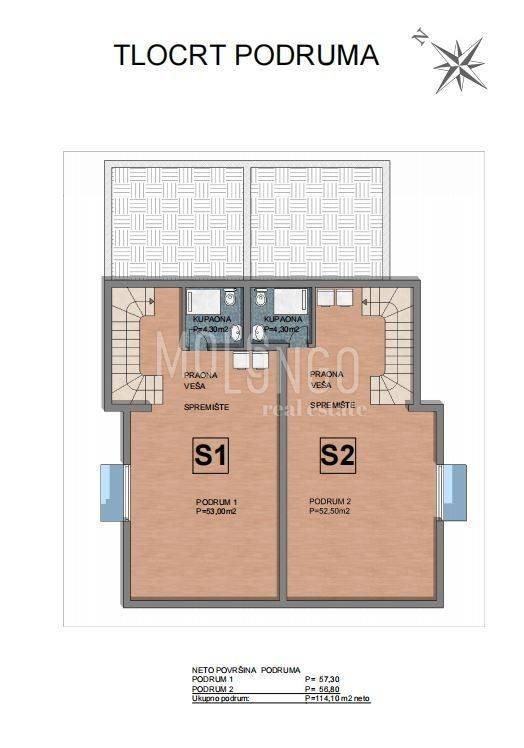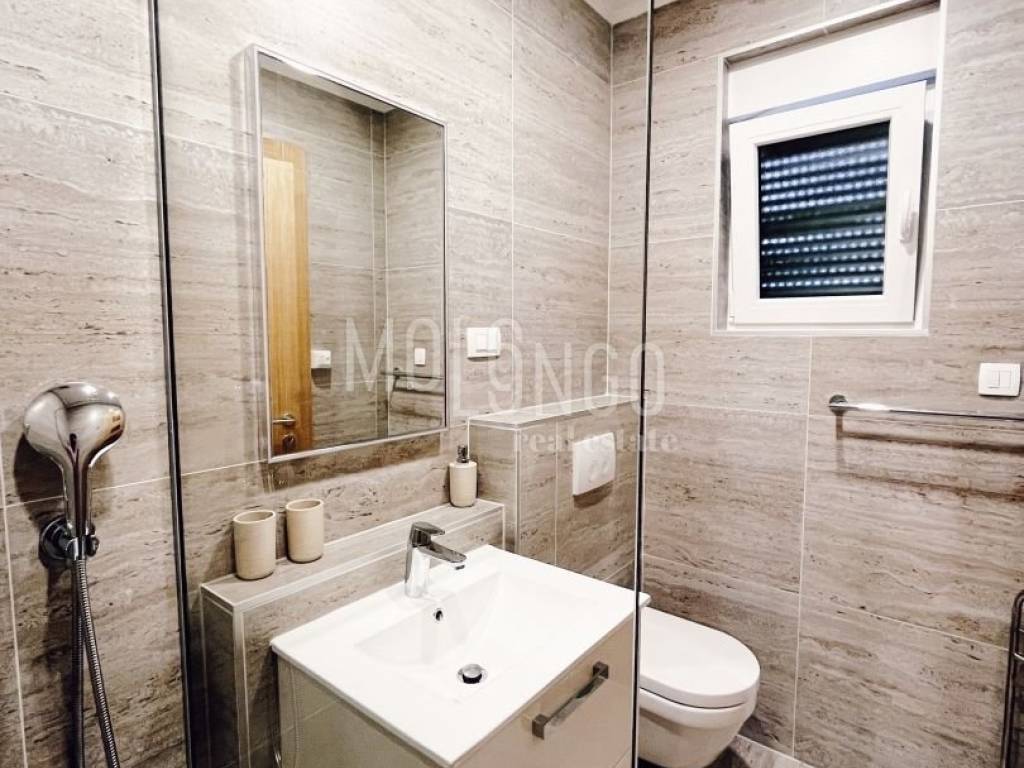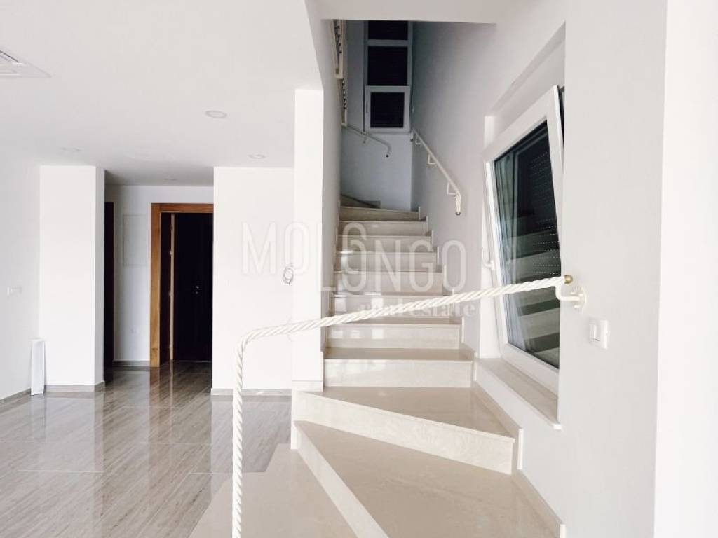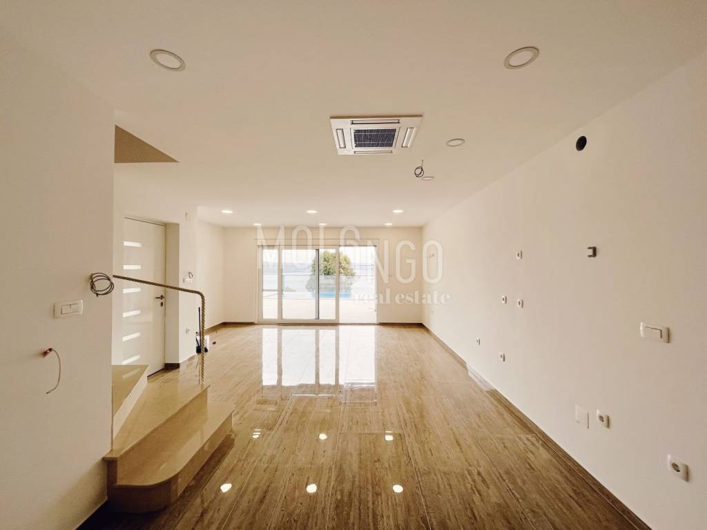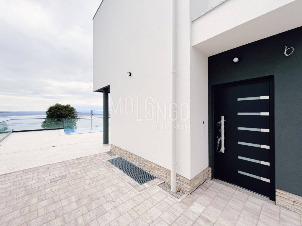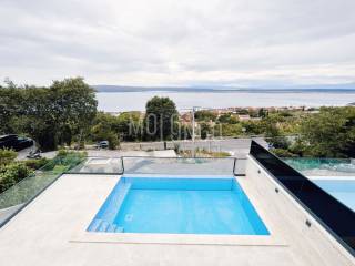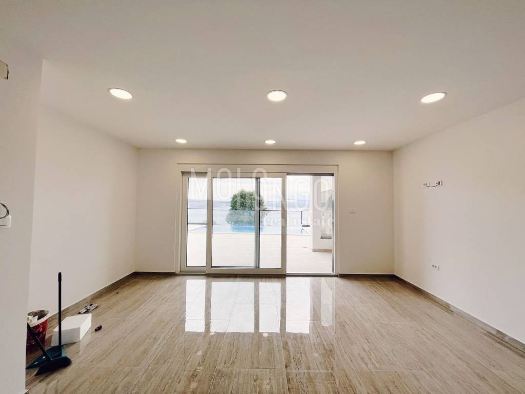 Al piano terra si trova un ampio soggiorno con accesso al terrazzo dove si trova una piscina. Il soggiorno è ampio e confortevole con pareti in vetro. Ciò consente al futuro cliente molta luce del giorno, calore e una splendida vista sul mare e sull'isola di Krk dal divano.
