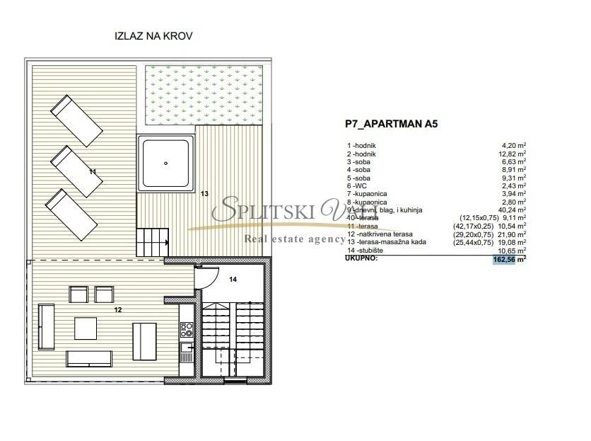 Neto stambena površina iznosi 92,00 m, dok ukupna bruto površina s krovnom terasom iznosi 162,56 m.