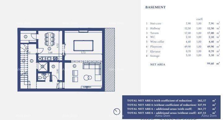 Questa villa indipendente si trova in un lussuoso complesso residenziale chiuso nel nord della penisola istriana.Il complesso è composto da 55 ville, un aparthotel con 179 appartamenti, una grande piscina comune a sfioro di 105 metri e tre edifici più piccoli con 6 appartamenti ciascuno.Le ville di questo tipo si trovano nella parte centrale del terreno e la maggior parte delle stanze offre una vista libera sulla splendida baia. La villa di tipo 3 è semi-indipendente, con ingresso a sud. La villa è composta da 3 camere da letto, una stanza studio, 4 bagni, un soggiorno aperto con vista fantastica, una sala giochi, un garage per due auto e un giardino.La superficie netta della villa 39 di 328,46 m² include il seminterrato, il piano terra, il primo e il secondo piano.Il seminterrato è composto da: scala, corridoio, cantina, WC, cantina per vini, sala giochi, ascensore, ripostiglio. Al piano terra della villa si trovano: scala, corridoio, stanza studio, bagno, locale tecnico, garage, cucina. Al primo piano si trovano scala, corridoio, lavanderia, 2 camere da letto, 2 bagni, terrazze. Al secondo piano si trovano cucina + sala da pranzo + soggiorno, WC, camera da letto, bagno e terrazza.L"interno della villa è caratterizzato da soffitti ribassati in tutte le stanze con un"altezza di 280 cm, piastrelle ceramiche di classe I Cerim, Caesar nei bagni, parquet di classe I nelle camere da letto, bagni Hansgrohe.Il riscaldamento e il raffreddamento dell"intera villa sono regolati da pompe di calore ad acqua, che sono anche silenziose. L"arredamento della villa è possibile in tre stili: mediterraneo, eclettico o modello di lusso.Per ulteriori informazioni, contattare: Azra +385 91 611 5706 +385 98 420 885 azra@almadominvest.com